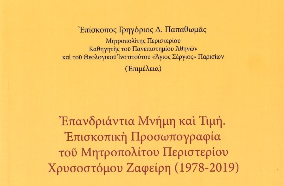 Μετά πολλής χαράς και συγκίνησης παρέλαβα το άρτι εκδοθέν πόνημα του Σεβ. Μητροπολίτου Περιστερίου κ. Γρηγορίου, με τίτλο: «ΕΠΑΝΔΡΙΑΝΤΙΑ ΜΝΗΜΗ ΚΑΙ ΤΙΜΗ. ΕΠΙΣΚΟΠΙΚΗ ΠΡΟΣΩΠΟΓΡΑΦΙΑ ΤΟΥ ΜΗΤΡΟΠΟΛΙΤΟΥ ΠΕΡΙΣΤΕΡΙΟΥ ΧΡΥΣΟΣΤΟΜΟΥ ΖΑΦΕΙΡΗ (1978-2019)», το οποίο εκδόθηκε από την Ιερά Μητρόπολη Περιστερίου, ως μέρος των εκδόσεων «Θεολογία και Ιστορία».