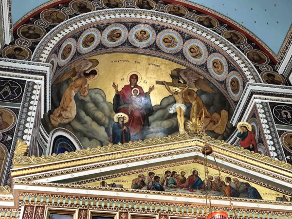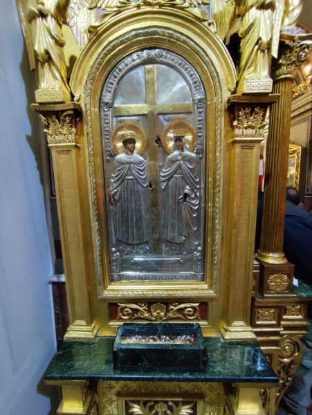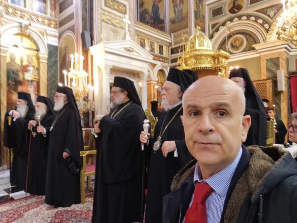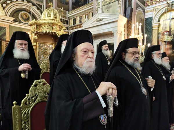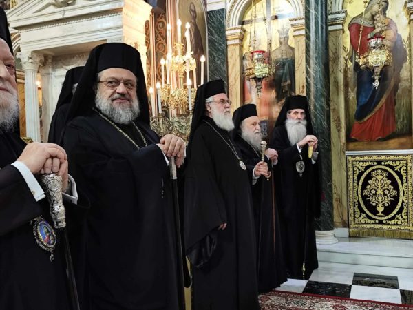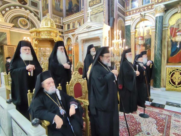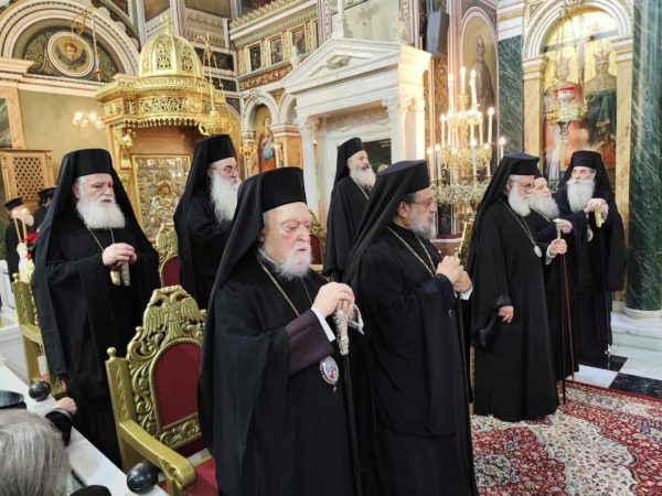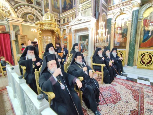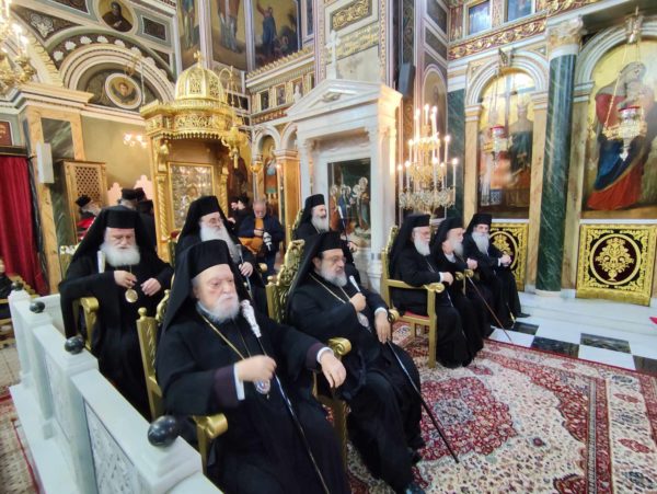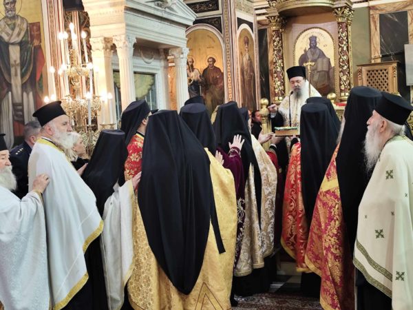 Κατέλαμπε έτσι στη χαρμόσυνη ατμόσφαιρα της εορτής ο λαμπροστόλιστος ναός του Αγίου Κωνσταντίνου και Ελένης στον Πειραιά, από τη βυζαντινή πορφύρα και την γαλανόλευκη, δημιου-ργώντας μία μοναδική ατμόσφαιρα ηθικής έξαρσης καικατάνυξης. Της πανηγυρικής πολυαρχιερατικης λειτουργίας, χοροστάτησε ο ευσεβής Μητροπολίτης Πατρών κ.κ. Χρυσόστομος, συγχοροστατούντων των σεπτών Μητροπολιτών Βρεσθένης κ.κ. Θεοκλήτου, Ύδρας Σπετσών και Αιγίνης κ.κ. Εφραίμ, συμπαραστατουμένων των ευλαβών μητροπολιτών Μεσσηνίας κ.κ. Χρυσοστόμου, Ιλίου, Αχαρνών και Πετρουπόλεως κ.κ. Αθηναγόρα, Γρεβενών κ.κ. Δαυίδ, Κορωνείας κ.κ. Παντελεήμονος, των ευσεβών Επισκόπων Ρωγών κ.κ. Φιλοθέου, Χριστιανουπόλεως κ.κ. Προκοπίου, Αχελώου κ.κ. Νύφωνος, των ευσεβών ιερέων του Αγίου Κωνσταντίνου π. Ιωάννη Παναγιώτου – και ιερατικού προϊσταμένου του ναού – π. Χρήστου Χριστοδούλου, π. Αντωνίου Φύτρου και του Ιεροδιακόνου π. Φανούριου Κατσαρού, καθώς και άλλων ιερέων από παρακείμενες ενορίες, που προσήλθαν να τιμήσουν την ιερή μνήμη του Αγιομάρτυρα Σεραφείμ, αλλά και να ευχηθούν στον εκλεκτό ιεράρχη της εκκλησίας της Ελλάδος, που διακρίνεται για την πολυμερή θεολογική, νομική του παιδεία, το εμπνευσμένο θεολογικό συγγραφικό του έργο, αλλά και το ευγενές ήθος του κ.κ. Σεραφείμ.