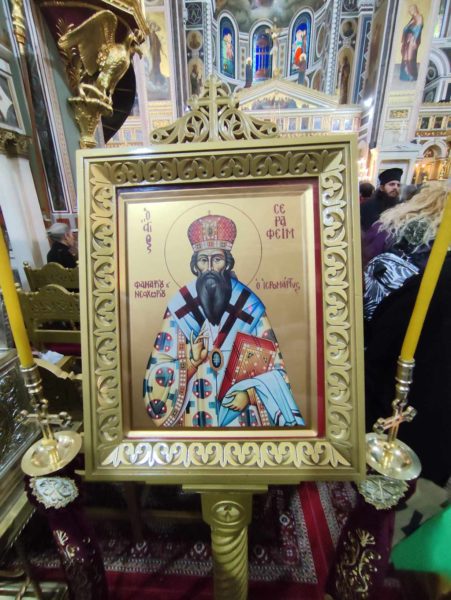 Στο μεγαλοπρεπή και πανέμορφο λοιπόν ναό του Αγίου Κωνσταντίνου και Ελένης στον Πειραιά, με τη συμμετοχή των προαναφερομένων μας Μητροπολιτών και Επισκόπων, την καταιγιστική παρουσία του φιλάγιου λαού του Πειραιώς και πλήθους εκπροσώπων από το φάσμα των γραμμάτων της πολιτικής και του πολιτισμού, πραγματοποιήθηκε με την προσήκουσα ιεροπρέπεια, η πολυαρχιερατική πανηγυρική λειτουργία για τον Άγιο Σεραφείμ, μέσα σε μία ατμόσφαιρα ευλάβειας και κατάνυξης. Με την αποπεράτωση της λειτουργίας ο σεπτός και εορτάζων Μητροπολίτης Πειραιώς κ.κ. Σεραφείμ, ευχαρίστησε τους ευσεβείς ιεράρχες που τίμησαν με την παρουσία τους τον Άγιο Σεραφείμ, αλλά και για τις ευγενείς ευχές τους και ευχήθηκε σε όλους τους παριστάμενους, ο ιερομάρτυρας της Ορθοδοξίας μας Σεραφείμ, που με το φρικτό του θάνατο, κέρδισε τη βασιλεία των ουρανών, να χαρίζει υγεία, πνευματική ευημερία και να συνιστά ηθικό οδείκτη στη ζωή μας σε κάθε μας βήμα. Στην αντιφώνησή του ο ευλαβής Μητροπολίτης Πατρών κ.κ. Χρυσόστομος ευχαρίστησε τον κ-ο Σεραφείμ για την ευγενή του πρόσκληση, και αναφέρθηκε διεξοδικά στην ηθική αρετή του Αγιομάρτυρα της εκκλησίας μας Σεραφείμ, αλλά και στο διαρκές και επίκαιρο ηθικά μήνυμα του, για την απαραίτητη προσήλωση μας στην ορθόδοξη πίστη και στην κοινωνική μας εκπόρευση, με ηθική σταθερά, τους πνευματικούς αγώνες, το αίμα και τη θυσία του Αγίου της εκκλησίας μας.