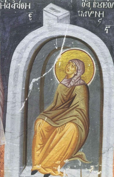 Η Αγία μέσα στην φυλακή εικονίζεται σε τοιχογραφία του 1721 στο παρεκκλήσιο του Αγίου Δημητρίου της Ι. Μεγίστης Μονής Βατοπαιδίου.