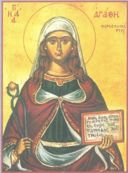 Το καύχημα των παρθένων και κλέϊσμα των μαρτύρων, η Αγία Αγάθη, έζησε κατά τον 3ο αιώνα, όταν αυτοκράτορας των Ρωμαίων ήταν ο Δέκιος και έπαρχος της γενέτειράς της νήσου Σικελίας, ο Κουϊντιανός. Την ίδια περίοδο στην πόλη των αποστόλων και αναρίθμητων μαρτύρων, Ρώμη, επίσκοποι ήταν οι ενάρετοι Φαβιανός (236-250) και Κορνήλιος (251-253).