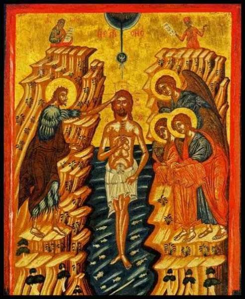 Ο Χριστός βρίσκεται μεταξύ ψηλών βράχων, που σμίγουν και σχηματίζουν «κλεισούραν». Τα νερά, που δεν είναι αγιασμένα, μας θυμίζουν την εικόνα του θανάτου – κατακλυσμού. Ο συμβολισμός των βράχων της εικόνας της γεννήσεως συνεχίζεται στην εικόνα των Θεοφανίων και καταλήγει στην εικόνα της καθόδου του Χριστού στον Άδη. Η εικόνα της βαπτίσεως παρουσιάζει τον Ιησού να εισέρχεται στα νερά, στον υγρό τάφο. Ο Άδης έχει την μορφή ενός σκοτεινού σπηλαίου, που περιέχει όλο το σώμα του Κυρίου, δείχνοντας την προκάθοδο Του στον Άδη, για να διαλύσει το δυνατό του κόσμου τούτου. Όπως αναφέρει και ο άγιος Κύριλλος Ιεροσολύμων, ο Ιησούς «Καταβάς ἐν ὕδασιν ἔδησε τόν ἰσχυρόν».