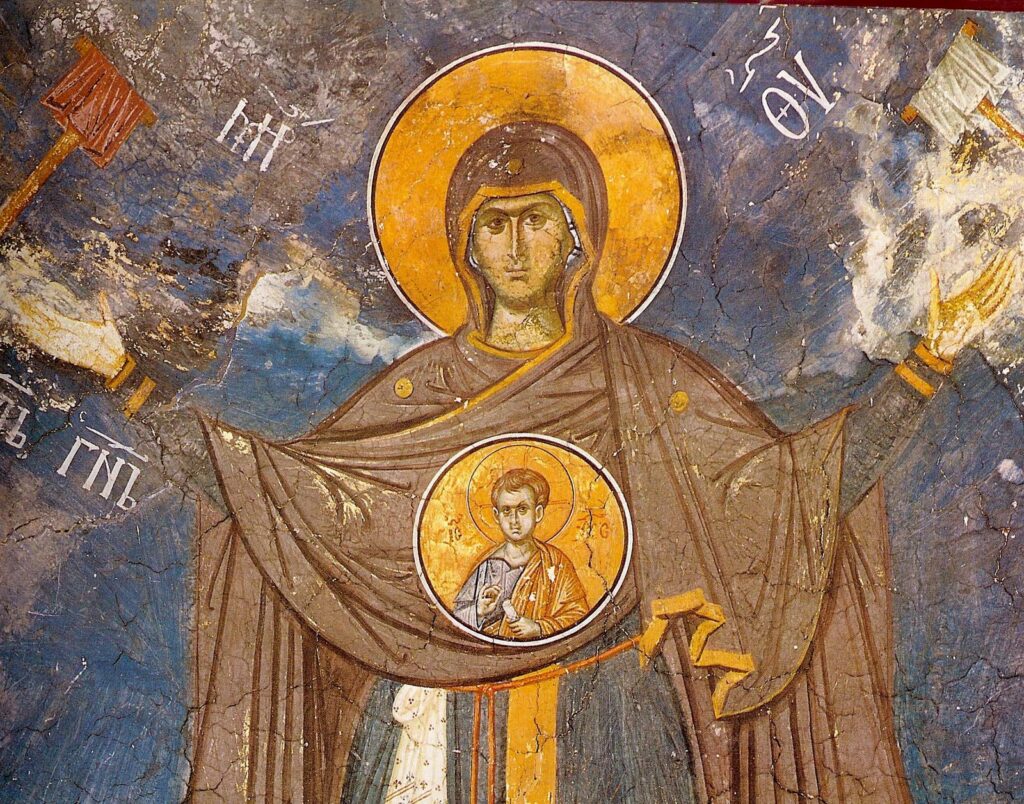 Κοντάκιο: Τῇ ὑπερμάχῳ στρατηγῷ τὰ νικητήρια, ὡς λυτρωθεῖσα τῶν δεινῶν εὐχαριστήρια, ἀναγράφω σοι ἡ Πόλις σου Θεοτόκε. Ἀλλ’ ὡς ἔχουσα τὸ κράτος ἀπροσμάχητον ἐκ παντοίων με κινδύνων ἐλευθέρωσον, ἵνα κράζω σοι• Χαῖρε, Νύμφη ἀνύμφευτε».