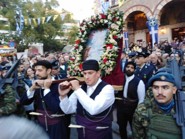 Με το πέρας του εσπερινού επακολούθησε η εκλιτάνευση της σεπτής εικόνας του Αγίου Δημητρίου, αλλά και αποτμήματος ιερών λειψάνων αγίων μας, στους περιμετρικούς δρόμους του ναού, με την συνοδεία της φιλαρμονικής του Δήμου Αθηναίων και της Αστυνομίας, που χρωμάτισαν αισθητικά την ατμόσφαιρα, με τους χαρμόσυνους παιάνες τους.