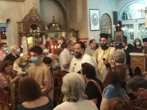 Της πανηγυρικής ευχαριστιακής ακολουθίας, χοροστάτησε ο σεπτός Πρωτοσύγκελος της Αρχιεπισκοπής Αθηνών κ.κ. Βαρνάβας Θεοχάρης, συνεπικουρούμενος από τον ευλαβή ιερέα του ναού, τον προϊστάμενο πατέρα Νικόλαο Κούβαρη, αλλά και από άλλους πατέρες που προσήλθαν ευλαβικά, για να τιμήσουν το κορυφαίο σύμβολο της πίστης μας. Συγκινητική η παρουσία στον εσπερινό ιεροπαίδων, καθώς και πολιτισμικών σωματείων με παραδοσιακές φορεσιές, που ευλαβικά τίμησαν την εορτή.