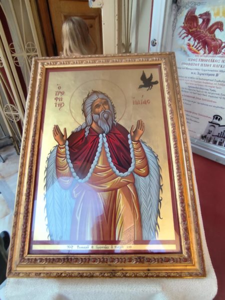 Καιφάνταζε σε αυτό το κατανυκτικό λιόγερμα του Ιουλίου, η πανέμορφη εκκλησία της οδού Αρύββου, σαν ένα πελώριο ξωκλήσι, που θαρρείς ανέδυε από την μεγάλη πύλη του, ο Προφήτης Ηλίας. Με έκδηλη την φροντίδα και την αγάπη στον καθαρισμό και στολισμό του ναού, από τον ιερατικό προϊστάμενο της εκκλησίας αρχιμανδρίτη κο Νεόφυτο Δοντά. Της πανηγυρικής λειτουργίας χοροστάτησε ο σεπτός Επίσκοπος Κρήνης κ.κ. Κύριλλος – που είναι παράλληλα και καθηγητής της Θεολογικής Σχολής του Πανεπιστημίου Αθηνών – συνεπικουρούμενος από τον ευλαβή πρωτοσύγκελο της Αρχιεπισκοπής Αθηνών κ.κ. Βαρνάβα Θεοχάρη, τον ευσρεβή προϊστάμενο της εκκλησίας Αρχιμανδρίτη κ.κ. Νεόφυτο, τους υπολοίπους ιερείς της εκκλησίας, αλλά και από άλλους ιερείς της Αρχιεπισκοπής Αθηνών, που με ξεχωριστή ευλάβεια και ζέση, προσήλθαν για να τιμήσουν τον κορυφαίο της ορθοδοξίας μας, Προφήτη Ηλία.