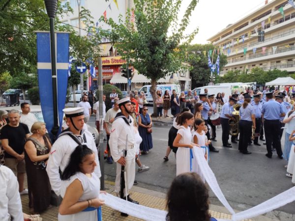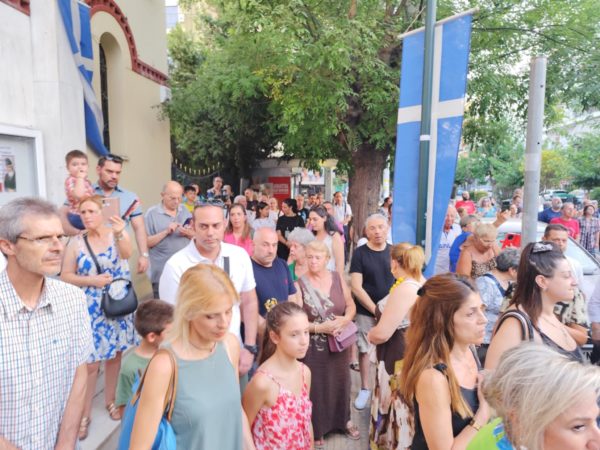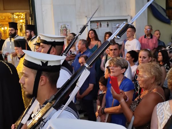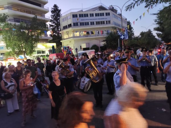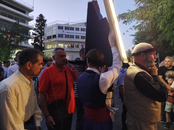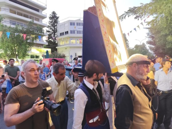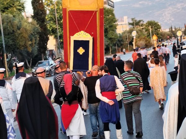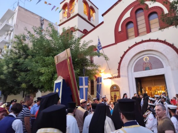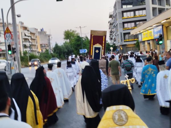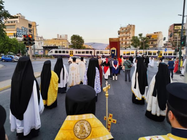 Με το πέρας της λειτουργίας, επακολούθησε εκλιτάνευση της ιεράς εικόνος της Αγίας, στους παρακείμενους δρόμους του ναού, υπο τους γλυκείς παιάνες της Φιλαρμονικής του Πυροσβεστικού Σώματος – η οποία ευγενικά συμμετείχε στην πανήγυρη- που προσέδωσε ξεχωριστό χρώμα στην πομπή, αλλά και την συνοδεία παραδοσιακού χορευτικού τμήματος της Κρήτης, που λάμπρυνε και αυτό με τις ωραίες ελληνικές παραδοσιακές φορεσιές του, την ιερά λιτανεία. Σε κλίμα ηθικής έξαρσης οι κάτοικοι των πολυκατοικιών, στους δρόμους της πομπής, για την άχραντη μνήμη της Παρθενομάρτυρος Μαρκέλλας, που έραιναν ένδακρεις την σεπτή εικόνα της, με μύρα και ροδοπέταλα. Είναι στιγμές που εγγίζει κανείς τα ακένωτα κοιτάσματα ευσέβειας του χριστιανικού λαού μας και πείθεται, ότι ο ευλογημένος από τον Χριστό, λαός των Ελλήνων, δεν θα πέσει ποτέ και με τίποτα.