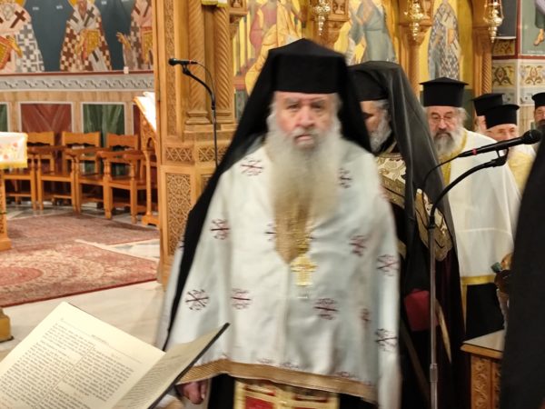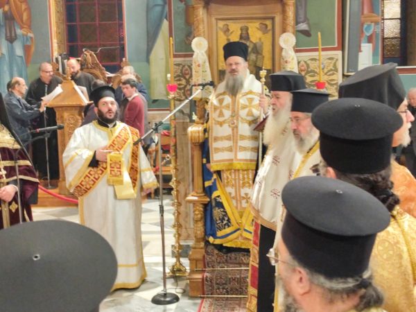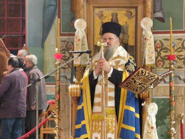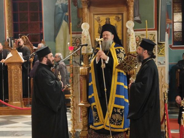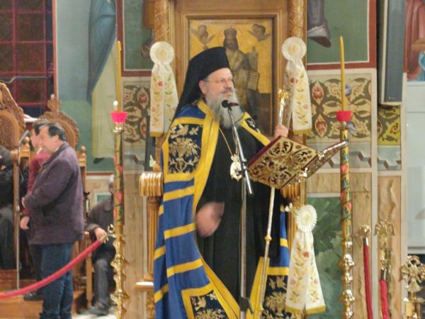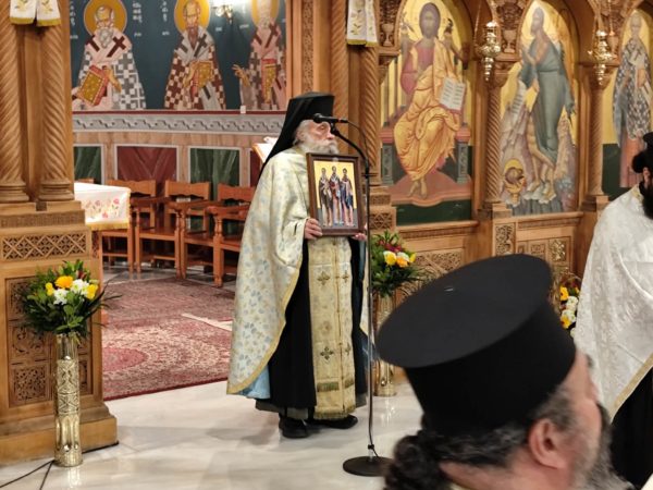 Στονμεγαλοπρεπή ναό των Τριών Ιεραρχών, φάνταζαν επιβλητικά, οι χρυσοπόρφυροι δικέφαλοι αετοί του Βυζαντίου – που τον σημαιοστόλιζαν – και πρόσφεραν μοναδική ανάταση στους χριστιανούς, που αντλούσαν ακένωτες ηθικές δυνάμεις, από το πνευματικό θάμπος και το ηθικό φέγγος της ορθόδοξης εκκλησίας μας, αλλά και την πνευματική μεγαλουργία του Βυζαντίου. Του πανηγυρικού εσπερινού χοροστάτησε ο ευλαβής Επίσκοπος Επιδαύρου κ.κ. Νικόδημος, συνεπι-κουρούμενος από τον ευσεβή προϊστάμενο του ναού πατέρα Νικόλαο Μαρκαντώνη, αλλά και από άλλους ευλαβείς ιερείς από γειτονικές εκκλησίες, που προσήλθαν να τιμήσουν την σεπτή μνήμη τωντρεισμεγίστων φωστήρων. Με το πέρας του εσπερινού ο Επίσκοπος κος Νικόδημος, με τον έμπεδο θεολογικά και γλυκύ λόγο του, απηύθυνε έναν συγκινητικό χαιρετισμό, για την μείζονα ηθική αξία της πολυεδρικής παρουσίας και προσφοράς των Μεγίστων Ιεραρχών μας, Ιωάννου, Βασιλείου και Γρηγορίου, σταχριστιανικά γράμματα και την ορθόδοξη εν γένει εκκλησία. Ενώ ο προϊστάμενος του ναού, Πατέρας κος Νικόλαος Μαρκαντώνης ευχαρίστησε τον ευλαβή Επίσκοπο Επιδαύρου κ.κ. Νικόδημο, που λάμπρυνε με την παρουσία του την εορτή, τους πιστούς για την καθολική τους συμμετοχή, το φιλόπτωχο ταμείο, την ερανική επιτροπή και τους εθελοντές του ναού, για την ακάματη φροντίδα τους στην άψογη διοργάνωση της τελετής.