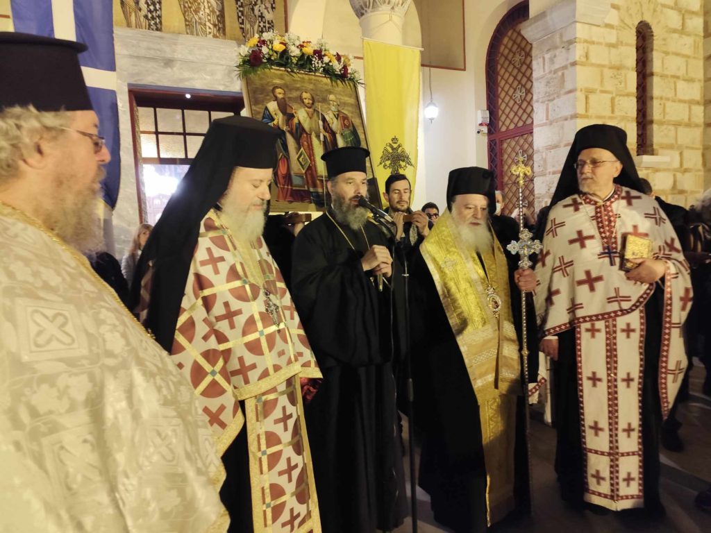 Με την επάνοδο της ιεράς εικόνας στην εκκλησία, ο πανοσιολογιώτατος Αρχιμανδρίτης κ.κ. Θεολόγος Αλεξανδράκης, Διευθυντής του Ιδρύματος Ποιμαντικής Επιμορφώσεως της Αρχιεπι-σκοπής Αθηνών, απηύθυνε έναν συγκινητικό χαιρετισμό, για την μείζονα ηθική αξία της πολυεδρικής παρουσίας και προσφοράς των Μεγίστων Ιεραρχών μας, Ιωάννου, Βασιλείου και Γρηγορίου, στα χριστιανικά γράμματα και την ορθόδοξη εν γένει εκκλησία.Ενώ ο προϊστάμενος του ναού, Πατέρας κος Νικόλαος Μαρκαντώνης ευχαρίστησε τον ευλαβή Επίσκοπο Ρωγών κ.κ. Φιλόθεο που λάμπρυνε με την παρουσία του την εορτή, τους πιστούς για την καθολική τους συμμετοχή, το φιλόπτωχοταμείο, την ερανική επιτροπή και τους εθελοντές του ναού, για την ακάματη φροντίδα τους στην άψογη διοργάνωση της τελετής, αλλά και την Φιλαρμονική του Δήμου και την Ελληνική Αστυνομία, για την προσφορά τους.