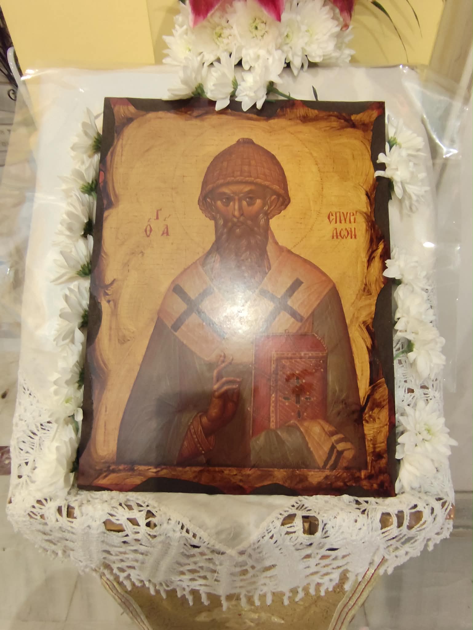 Παραθέτουμε το Απολυτίκιο του Αγίου Σπυρίδωνος : Τῆς Συνόδου τῆς πρώτης ἀνεδείχθης ὑπέρμαχος, καὶθαυματουργὸς θεοφόρε, Σπυρίδων Πατὴρἡμῶν· διὸνεκρᾷσὺἐν τάφῳ προσφωνεῖς, καὶὄφινεἰς χρυσοῦν μετέβαλες· καὶἐν τῷ μέλπειν τὰς ἁγίας σου εὐχάς, Ἀγγέλους ἔσχες συλλειτουρ-γούντάς σοι Ἱερώτατε. Δόξα τῷ σὲδοξάσαντι Χριστῷ· δόξα τῷ σὲστεφανώσαντι· δόξα τῷ ἐνεργούντι διὰσοῦ, πᾶσιν ἰάματα.