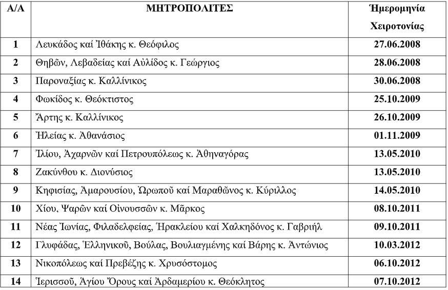 Α΄ ΠΙΝΑΚΑΣ ΜΗΤΡΟΠΟΛΙΤΩΝ ΟΙ ΟΠΟΙΟΙ ΕΞΕΛΕΓΗΣΑΝ ΕΠΙ ΑΡΧΙΕΠΙΣΚΟΠΟΥ