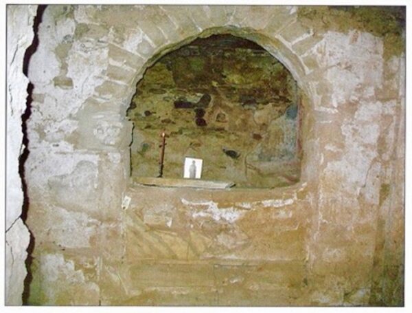 Ὁ περίφημος προσκυνηματκὸς ναὸς τοῦ Ὁσίου, ποὺ ἤδη πιὸ πάνω ἀναφέραμε πὼς κτίσθηκε ἐπάνω ἀπὸ τὸν ταφικό του ὑπόγειο θάλαμο, καὶ ποὺ ἦταν, ὅπως συμπεραίνεται, μία τρίκλιτη βασιλική, κατέπεσε ἀπὸ σειρὰ σεισμικῶν δονήσεων, ποὺ ἔπληξαν τὸ νησί μας κατὰ τὸ 149115. Ἡ τοπικὴ ὅμως παράδοση (τῆς περιοχῆς), λόγῳ ἀγνοίας τῆς μαρτυρουμένης ἀπὸ τὶς πηγὲς κατάρρευσης ἀπὸ σεισμό, συσχέτισε τὴν καταστροφὴ αὐτὴ μὲ τὴν εἰσβολὴ στὴν Κύπρο τοῦ Ριχάρδου Λεοντόκαρδου πρὸς ἐκδίκηση τοῦ τυράννου τοῦ νησιοῦ Ἰσαακίου Κομνηνοῦ (χωρὶς βέβαια νὰ ἀναφέρονται τὰ ὀνόματα αὐτὰ στὴ διήγηση)! Τὴν παράδοση αὐτὴ στήριζαν στὴν ὕπαρξη μέχρι πρὶν ἀπὸ λίγα χρόνια στὰ ἐρείπια τοῦ ναοῦ μεγάλης σιδερένιας σφαίρας κανονιοῦ. Εἶναι πιθανὸν νὰ κτυπήθηκε ὁ οἰκισμὸς σὲ κάποια μάχη, ἴσως κατὰ τὴν εἰσβολὴ τῶν Τούρκων τὸ 1570.