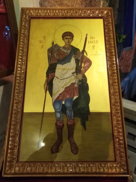 Του Αγίου Δημητρίου που καίτοι γεννημένος και αναθρεμμένος, σε ένα περιβάλλον κοινωνικής και οικονομικής ευκρασίας, που προδιέγραφε μια λαμπρή κοινωνική και στρατιωτικοπολιτική καριέρα, δεν δίστασε, να τα θυσιάσει όλα για τη αγάπη του Χριστού μας. Για να διατρανώσει σε όλο τον πολιτισμένο τότε κόσμο με τον μαρτυρικό θάνατό του, την ηθική υπεροχή της Ορθοδοξίας, αλλά και την υπερτάτη αξία, να πέφτεις κανείς για ιδεώδη και ιδανικά, περιφρονώντας τις φθαρτές αξίες και τα πλαστά πρότυπα ζωής. Ο Ιερός Δημήτριος γεννήθηκε περί το 280 μ.Χ. στην Θεσσαλονίκη και πολύ γρήγορα με τις ασύγγνωστες για την ηλικία του αρετές και ικανότητες, ανελίχθη στον επίζηλο βαθμό του χιλίαρχου, υπο την διοίκηση του Τετράρχη και μετέπειτα αυτοκράτορα της Ρώμης Γαλερίου Μαξιμιανού και όταν στο στέμμα ήταν ο τρομερός για τους διωγμούς του Διοκλητιανός. Γοητεύτηκε από το ιδεώδες της Ορθοδοξίας και προσκύνησε τον Χριστιανισμό, ιδρύοντας παράλληλα και έναν κύκλο για την μελέτη της Αγίας Γραφής. Αγνοώντας αγέρωχα, το διάταγμα του Διοκλητιανού, «περί αρνήσεως του Χριστιανισμού», ήλθε σε ευθεία ρήξη με τον Μαξιμιανό, που διέταξε να τον φυλακίσουν. Στην φυλακή ευρίσκονταν και ένας νεαρός και ατρόμητος Χριστιανός – που θα τον έβαζαν προκειμένου να οδηγηθεί στο θάνατο, να παλαίψει με τον φοβερό και γιγαντόσωμο μονομάχο της εποχής Λυαίο – ο Νέστορας, που έσπευσε να ζητήσει την ευχή και την ηθική στήριξη του Δημητρίου, για την θανατηφόρο μάχη του. Και πράγματι με την πρεσβεία προς τον Χριστό του Δημητρίου, ο Νέστορας έκανε το θαύμα στην κυριολεξία και νίκησε τον γίγαντα Λυαίο, αφήνοντας αμήχανους τον Μαξιμιανό και τους ειδωλολάτρες επιτελείς του ! Και τότε εξοργισμένος ο τελευταίος, έδωσε εντολή – το 303 ή το 305 μ.Χ., να θανατώσουν τους «ασεβείς» Νέστορα και Δημήτριο, που τον ταπείνωσαν δημοσίως, με την θεόπνευστη δύναμή τους. Το μεν Νέστορα με αποκεφαλισμό, τον δε Δημήτριο δια του ειδεχθούς λογχισμού ! Αναφέρεται από τους δημιουργούς των εγκωμίων του Αγίου Δημητρίου, Γρηγόριο Παλαμά, Ευστάθιο Θεσσαλονίκης και Δημήτριο Χρυσολωρά, ότι ο το σεπτό σώμα του Δημητρίου ετάφη στον σημείο του μαρτυρίου του, όπου και μετεβλήθη σε βαθύ φρέαρ στη γή, από το οποίο ανέβλυζε μύρο ! Για τούτο και εδόθη στον Ιερό Δημήτριο, το προσωνύμιο Μυροβλήτης. Για να αποτελεί τον ηθικό Έφορο και Προστάτη της νύμφης του Βορρά Θεσσαλονίκη μας. Είναι χαρακτηριστικά δε δυο θαύματα του Αγίου Δημητρίου σε Αθήνα και Θεσσαλονίκη. Στην μεν Θεσσαλονίκη ανήμερα της ιερής μνήμης του, επέπρωτο από την ιστορική μοίρα, η βασίλισσα της Βορείου Ελλάδος, μετά από αιώνες δουλείες, να παραδοθεί στον προελαύνοντα ελληνικό στρατό. Και κυμάτιζε και πάλι περήφανα στον Λευκό Πύργο η γαλανόλευκη. Στην δε Αθήνα, στα 1823 και κατά την πολιορκία της Ακροπόλεως οι Τούρκοι ήταν οχυρωμένοι στην Ακρόπολη και ο ελληνικός στρατός είχε αναπτυχθεί πέριξ του ναού του Αγίου Δημητρίου, τον οποίο και ετοιμάζονταν οι Τούρκοι να βομβαρδίσουν, με τις λουμπάρδες τους – «τούρκικα κανόνια». Τότε ως εκ θαύματος, με την θεία παρέμβαση του Αγίου Δημητρίου, οι μπαρουταποθήκες των Οθωμανών πήραν φωτιά και εξερράγησαν μαζί τους, σκορπώντας τους τον θάνατο και καταστρέφοντας και ένα μικρό τμήμα της Ακρόπολης ! Και ένεκα αυτού του θαύματος, ο Άγιος Δημήτριος έκτοτε, ονομάστηκε «Λουμπαρδιάρης» !