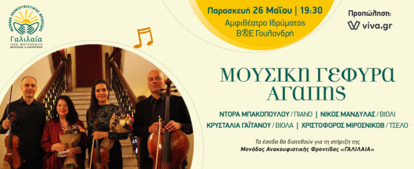 Στις 26 Μαΐου 2023 και ώρα 19:30 στο Αμφιθέατρο του Ιδρύματος Β&Ε Γουλανδρή (λινκ εισιτήρια: https://www.viva.gr/tickets/music/mousiki-gefyra-agapis-me-ti-ntora-mpakopoulou/) στο Παγκράτι, η μουσική θα προσφέρει Ανακουφιστική Φροντίδα με τον τρόπο που την υπηρετεί το Μη Κερδοσκοπικό Ίδρυμα Ανακουφιστικής Φροντίδας «Γαλιλαία»: σε κάθε άνθρωπο που πάσχει, ανεξαρτήτως εθνικότητας, θρησκευτικών πεποιθήσεων και οικονομικής ή ασφαλιστικής κατάστασης. Κι αυτό είναι πολύ σημαντικό.