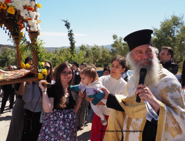Οι ριπές του ανέμου δεν αποθάρρυναν τα μικρά παιδιά να κρατήσουν, έστω και για λίγο τον Επιτάφιο. O Πανοσιολογιώτατος Αρχιμανδρίτης π. Μελέτιος Στάθης, κτήτορας και πνευματικός
