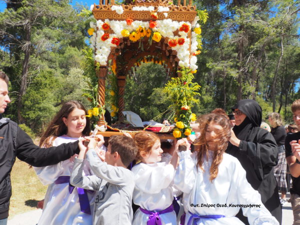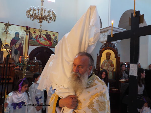 Οι ριπές του ανέμου δεν αποθάρρυναν τα μικρά παιδιά να κρατήσουν, έστω και για λίγο τον Επιτάφιο. O Πανοσιολογιώτατος Αρχιμανδρίτης π. Μελέτιος Στάθης, κτήτορας και πνευματικός