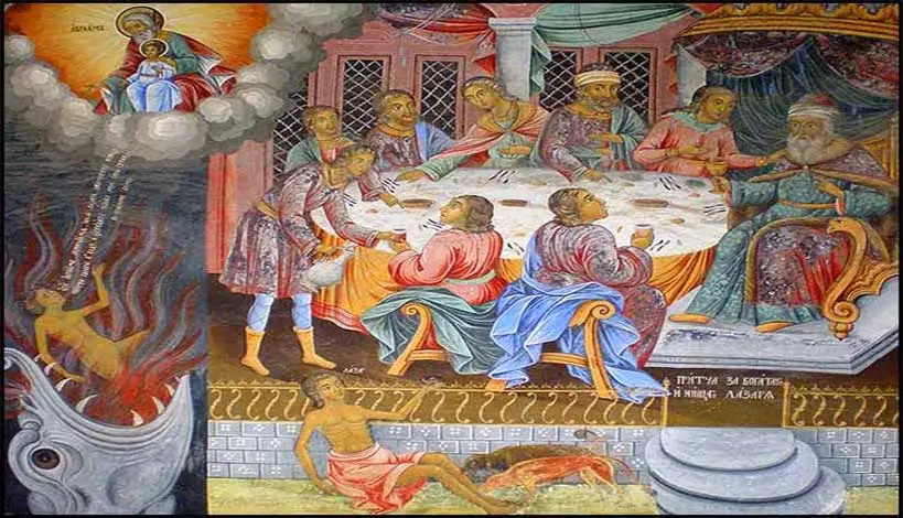 Ο πλούσιος βλέποντας την πορεία του Λαζάρου ζητά από τον πατριάρχη Αβραάμ να τον βοηθήσει ο Λάζαρος προκειμένου να σβήσει την φλόγα που τον έκαιγε. Και τότε ο Αβραάμ αρνείται να το πράξει τονίζοντας του ότι: “μεταξὺ ἡμῶν καὶ ὑμῶν χάσμα μέγα ἐστήρικται”(Λουκ. ιστ’,26). Με τη φράση του αυτή ο πατριάρχης Αβράαμ δείχνει την απόσταση που χωρίζει όσους έχουν σωθεί και όσους έχουν καταδικασθεί εξαιτίας της αμετανοησίας τους. Στην παρούσα ζωή δεν υπάρχει χάσμα μεταξύ αμαρτωλών και δικαίων. Μπορεί εκ φύσεως να ρέπει ο άνθρωπος προς την αμαρτία, ελκύοντας όμως τη χάρη του Θεού στη ζωή του έχει την ευκαιρία της πνευματικής του ανακαίνισης. Σε όποια παθογόνο κατάσταση κι αν βρίσκεται, μετανοώντας ειλικρινώς δύναται να οικειοποιηθεί την εν Χριστώ απολύτρωσή του. Αντιθέτως μεταβαίνοντας από την παροντική προσκαιρότητα στην μελλοντική αιωνιότητα και μένοντας αμετανόητος η ελπίδα της σωτηρίας του εκμηδενίζεται. Άρα στην μεταθανάτια ζωή υφίσταται η διαφορά και η διάσταση μεταξύ αμαρτωλών και δικαίων.