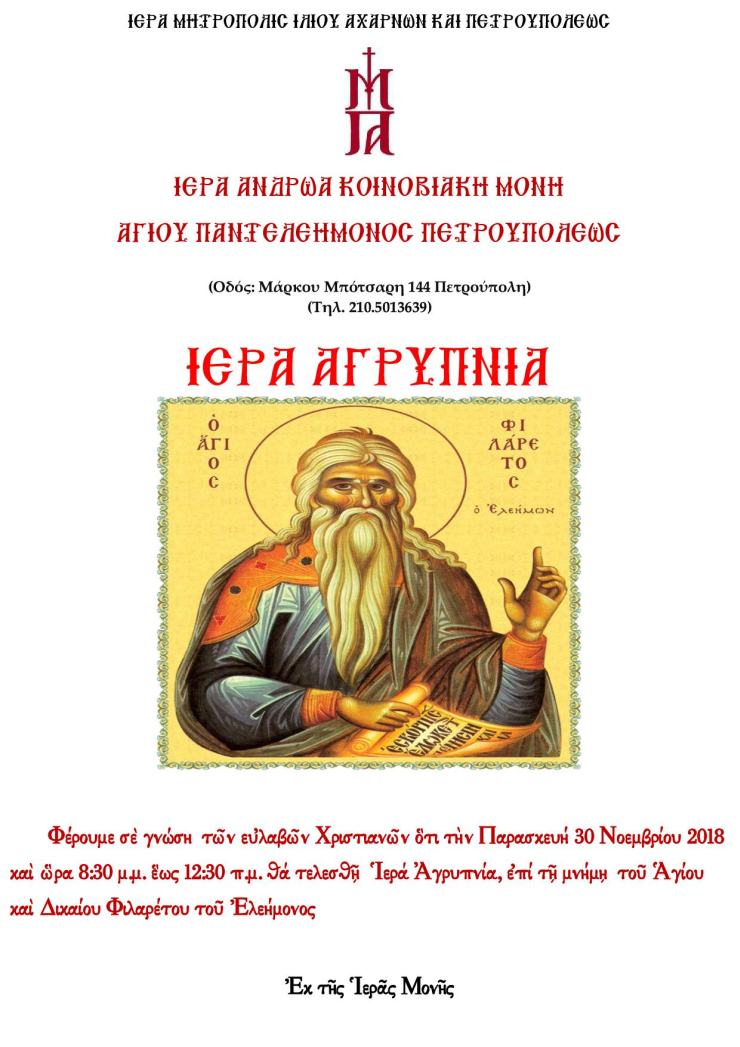 Ιερά Αγρυπνία για τον εορτασμό της μνήμης του Αγίου Φιλαρέτου θα τελέσει η Ιερά Μονή Αγίου Παντελεήμονος Πετρουπόλεως στις 30 Νοεμβρίου. Αναλυτικά η ανακοίνωση: