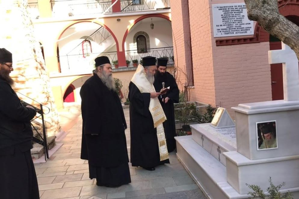 Εκεί τον υποδέχθηκε σύσσωμη η υπό τον Καθηγούμενο Αρχιμ. Γαβριήλ Εμμανουηλίδη ακμάζουσα Ιερά Αδελφότητα της Ι. Μονής, και ο Σεβασμιώτατος αφού προσκύνησε το Καθολικό και τους Αγίους της Ι. Μονής Δαυΐδ τον Γέροντα και Ιάκωβο τον νέο Ασκητή (Τσαλίκη), προστάτες και εφόρους της Ιεράς Μονής, τέλεσε Νεκρωσιμο Τρισάγιο επί του τάφου του μακαριστού Προηγουμένου Αρχιμ. Κυρίλλου Γεραντωνη, ο οποίος εόρταζε τούτη την ημέρα.