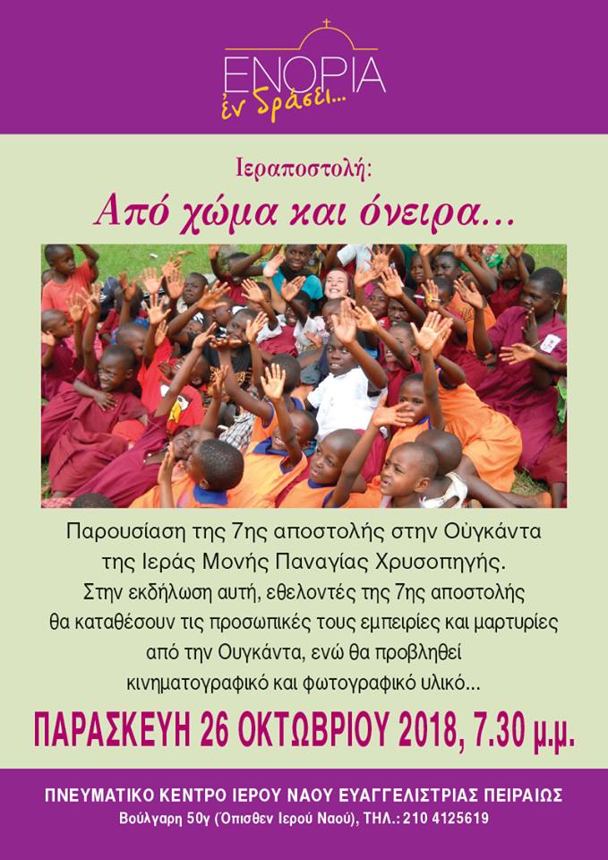 24/10/2018 24/10/2018 Την Παρασκευή 26 Οκτωβρίου θα πραγματοποιηθεί εκδήλωση-παρουσίαση της 7ης αποστολής στην Ουγκάντα της Ιεράς Μονής Παναγίας Χρυσοπηγής με τίτλο Χώμα και όνειρα…στο πνευματικό κέντρο Ευαγγελιστρίας Πειραιώς στις 7:30 μ.μ. Στην εκδήλωση αυτή οι εθελοντές της  Ιεραποστολής στην Ουγκάντα θα καταθέσουν τις προσωπικές τους εμπειρίες ενώ θα υπάρχει προβολή φωτογραφικού και κινηματογραφικού υλικού.