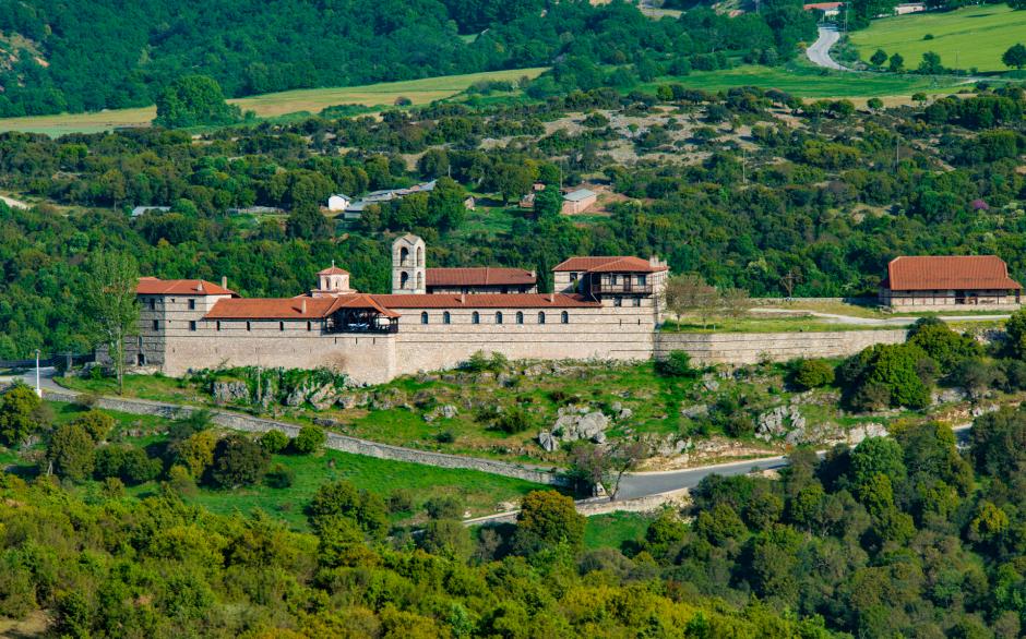 Υψηλό τείχος με πολεμίστρες περιβάλλουν το μοναστήρι και του δίνουν την εντύπωση φρουρίου. Κοντά στη μονή, στη μέση ενός γκρεμού, υπάρχει η σκήτη του Οσίου.