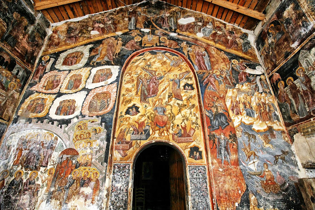 Είναι οι τοιχογραφίες που λαμπρύνουν το κτίσμα. Απλώνονται σε εκατοντάδες τετραγωνικά μέτρα αδιάσπαστης σχεδόν επιφάνειας στους θόλους και τους τοίχους ώς κάτω, όπου οι μοναχικές μορφές των αγίων στον κυρίως ναό και το ιερό, το νάρθηκα και τους εξαρτικούς ιστορούν τα μεγάλα ψυχωφελή και σπουδαία της Ορθοδοξίας, με συνέπεια στη λειτουργική χρήση και σημασία των χώρων, με αφάνταστο πλούτο σκηνών, σε μέγεθος φορητής εικόνας συνήθως. Οργανωμένες στην αφηγηματική διαδοχή τους με τάξη, σε εικονογραφικούς κύκλους που απορρέουν, συντείνουν και συνάπτονται με τις μεγάλες συνθέσεις στους θόλους και στα μέτωπα των τοίχων, έχουν έκταση και αριθμούς παραστάσεων και προσώπων που πραγματικά δε βρίσκουν το όμοιο τους στη μνημειακή ζωγραφική των μετά την Αλωση χρόνων. Το μεγαλεπήβολο έργο, που φαίνεται ότι άρχισε ο Νεόφυτος με την τοιχογράφηση του ξυλόστεγου τότε κυρίως ναού (1551/53), ανήκει κατά κύριο λόγο στον Ιωάσαφ τον Φιλανθρωπηνό, που προχώρησε και ολοκλήρωσε την εκτεταμένη διακόσμηση των ανακαινισμένων με θολοσκέπαστες οροφές χώρων το 1542 και 1560.