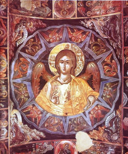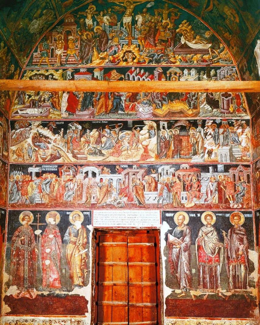 Η ευαγγελική διήγηση με έμφαση στα Πάθη και την Ανάσταση και με εισαγωγικές θεομητορικές παραστάσεις στον κυρίως ναό, όπου η Παναγία Πλατυτέρα κοσμεί την αψίδα του Ιερού, ο Ακάθιστος Υμνος και το Μηνολόγιο (Σεπτέμβριος – Νοέμβριος) στο νάρθηκα και στο βόρειο εξωνάρθηκα (Δεκέμβριος – Αύγουστος), ιστορίες της Παλαιάς Διαθήκης στο βόρειο και το νότιο και οι παραβολές του Χριστού στο δυτικό εξωνάρθηκα συνιστούν τους κύριους σε ανάπτυξη εικονογραφικούς κύκλους που αναδεικνύουν, στο ιστορικό γίγνεσθαι της Εκκλησίας, την αλήθεια και την ενότητα των Γραφών. Βιβλικές προεικονίσεις της Παναγίας και άλλες του Πάθους, θέματα της Παλαιάς Διαθήκης και παραβολές του Χριστού με παραστατικές αναφορές στη θεολογική ερμηνεία τους, συνάδουν στο προβαλλόμενο μυστήριο της θείας οικονομίας. Το δογματικό λόγο κορυφώνουν οι κυκλικές, όπως σε τρούλο, κεντρικές συνθέσεις θόλων με τον Χριστό στη δόξα, των Αίνων στο δυτικό εξωνάρθηκα, τον της Μεγάλης Βουλής Αγγελο σε όραμα προφητών στον νάρθηκα και τον μεγαλόπρεπο Παντοκράτορα με τους αγγέλους και προφήτες στον κυρίως ναό.
