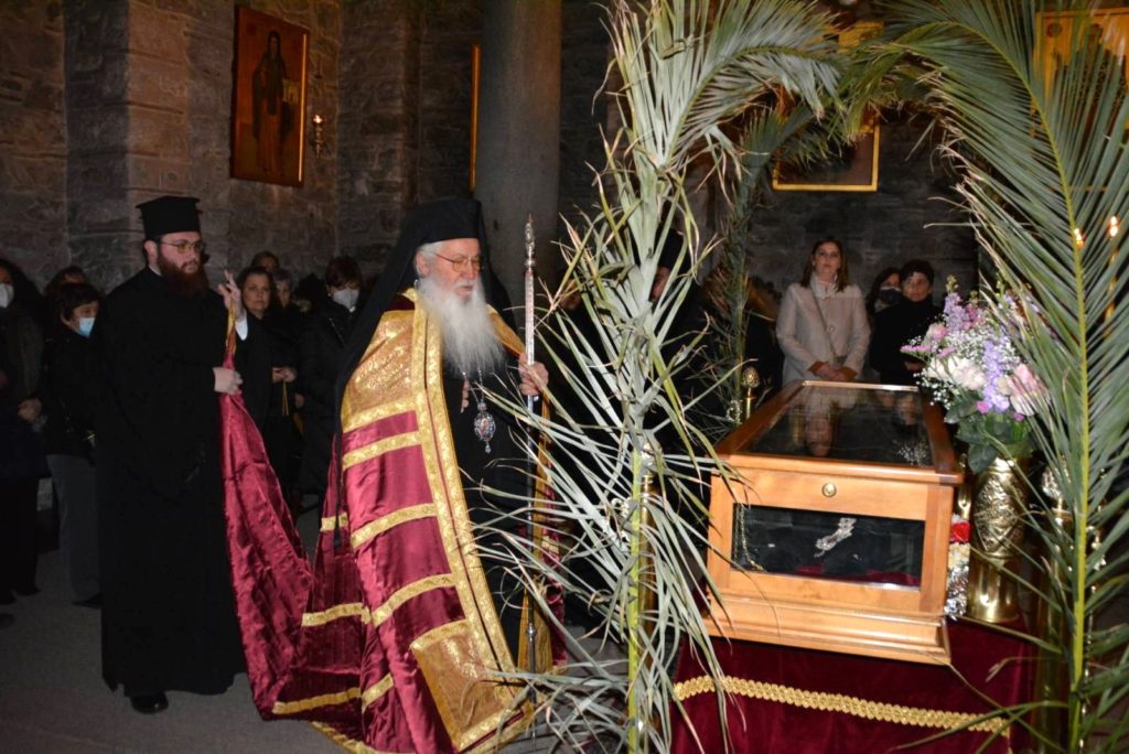 Την παραμονή της εορτής, Δευτέρα 6 Φεβρουαρίου 2023, νωρίς το απόγευμα έγινε η μεταφορά των ιερών λειψάνων του Οσίου από το Καθολικό, όπου μόνιμα φυλάσσονται, στον Ιερό Ναό της Παναγίας, όπου τελέστηκε ο Μικρός Εσπερινός και ο Αγιασμός. Κατόπιν, τελέστηκε ο Μέγας πανηγυρικός Εσπερινός χοροστατούντος του Σεβασμιωτάτου κ. Γεωργίου, με τη συμμετοχή πιστών και των αρχών του τόπου.