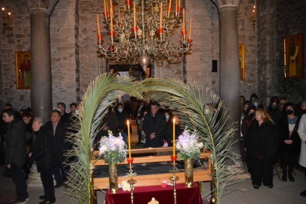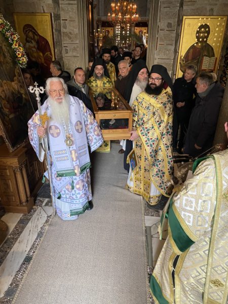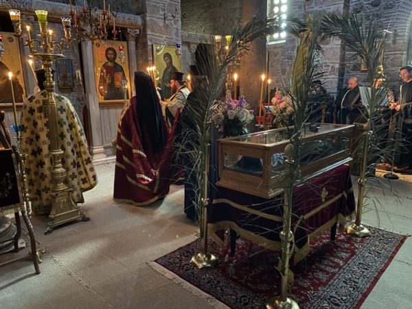 Μετά το πέρας της Θείας Λειτουργίας έγινε η μεταφορά των ιερών λειψάνων του Οσίου από το Ναό της Παναγίας, όπου είχαν μεταφερθεί για την εορτή, στη μαρμάρινη Λάρνακα στο Καθολικό, όπου μόνιμα φυλάσσονται.