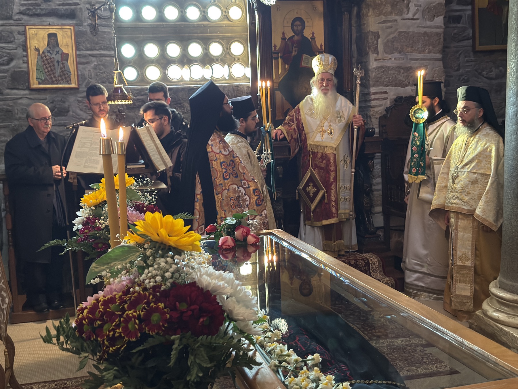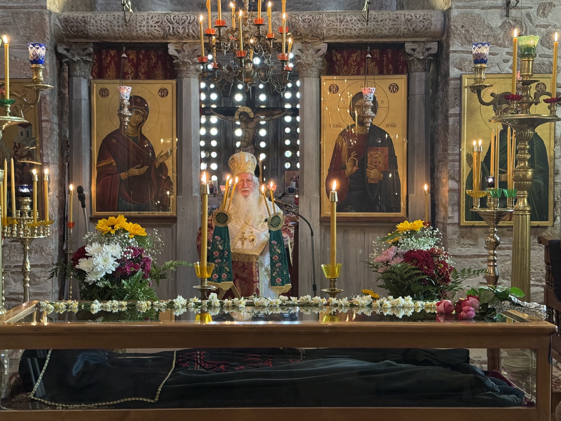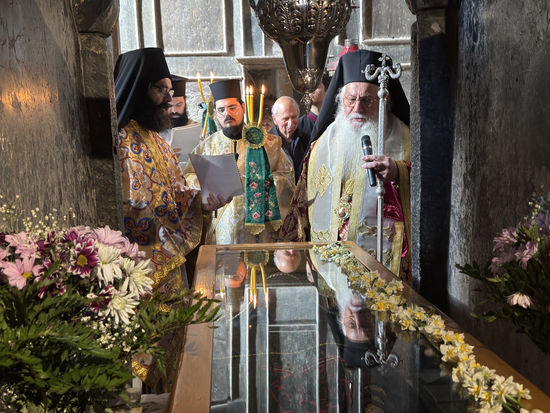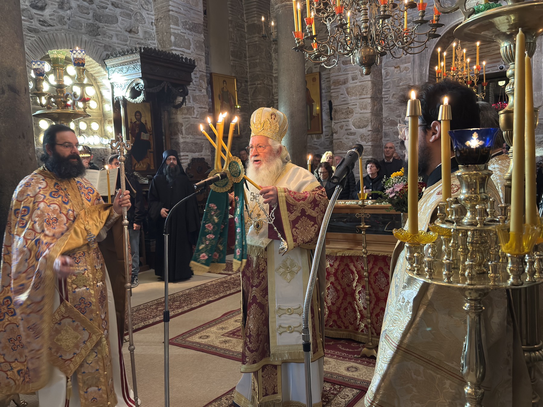 Στο τέλος της Θείας Λειτουργίας ο Σεβασμιώτατος Ποιμενάρχης μίλησε στους πιστούς αναφερόμενος στη ζωή του Οσίου και την ίδρυση της περιώνυμης Ιεράς Μονής του. Ιδιαιτέρως δε ο Σεβασμιώτατος αναφέρθηκε στο ιστορικό της επανόδου των ιερών λειψάνων του Οσίου στην Ιερά Μονή του, το Σάββατο των Προπατόρων 13 Δεκεμβρίου 1986, μετά από απουσία 526 χρόνων, και την επανατοποθέτησή τους στη μαρμάρινη λάρνακα του Καθολικού, όπου ήταν τοποθετημένα μέχρι το 1460 μ.Χ., όταν οι μοναχοί, λόγω της Τουρκοκρατίας, αναγκάσθηκαν να απομακρύνουν τα ιερά λείψανα από την Ιερά Μονή.
