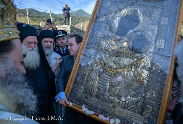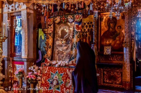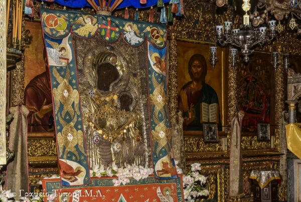 Εν συνεχείᾳ, η εικόνα μετεφέρθη στο Αγίασμα, το οποίο ευρίσκεται πλησίον του καθίσματος, όπου σύμφωνα με την παράδοση την πρωτο-τοποθέτησε ο μοναχός Γαβριήλ, όταν την έβγαλε από τη θάλασσα το 1004, και διενεμήθη το αντίδωρο στους πιστούς και στους προσκυνητές που προσήλθαν ευλαβικά, για να λάβουν τη χάρη και την ευλογία της Υπεραγίας Θεοτόκου όπου έμπροσθεν της μορφής της διαγράφεται μια πλούσια δέσμη ευγενών και δυνατών αισθημάτων ενώ η αυστηρή έκφραση του Ιερού Προσώπου Της, τονιζομένη από την επιβλητική και καθηλωτική ματιά Της, προξενεί το δέος.