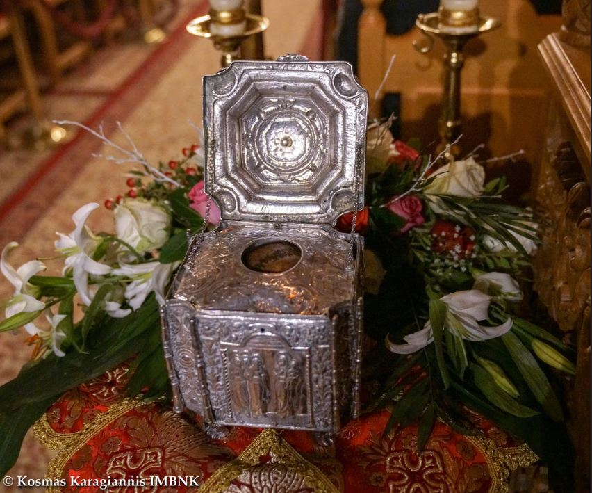 Καί ἡ ἱκεσία αὐτή ἔχει ἰδιαίτερη σημασία γιά μᾶς, καθώς τήν ἀναπέμπουμε ἔχοντας ἀνάμεσά μας τό ἱερό λείψανό του, τή σεπτή καί χαριτόβρυτη κάρα τοῦ ἁγίου, ἡ ὁποία ἀποτελεῖ δοχεῖο πλῆρες ἀπό τή χάρη τοῦ Θεοῦ, ἡ ὁποία ἐνοικεῖ σύμφωνα μέ τή διδασκαλία τῆς ἁγίας μας Ἐκκλησίας σέ ὅλα τά ἱερά λείψανα τῶν ἁγίων της. Γι᾽ αὐτό καί μυροβλύζουν καί εὐωδιάζουν καί θαυματουργοῦν καί ἀποτελοῦν πηγή ἰάσεων σωματικῶν καί ψυχικῶν ἀσθενειῶν.