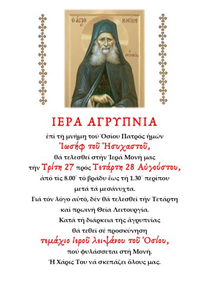 Αγρυπνία επί τη μνήμη του Οσίου Ιωσήφ του Ησυχαστή θα τελεσθεί στην Ιερά Γυναικεία Κοινοβιακή Μονή Παμμεγίστων Ταξιαρχών Πηλίου την Τρίτη 27 προς Τετάρτη 28 Αυγούστου 2024, από τις 8:00 μ.μ. μέχρι περίπου τη 1:30 μετά τα μεσάνυχτα.