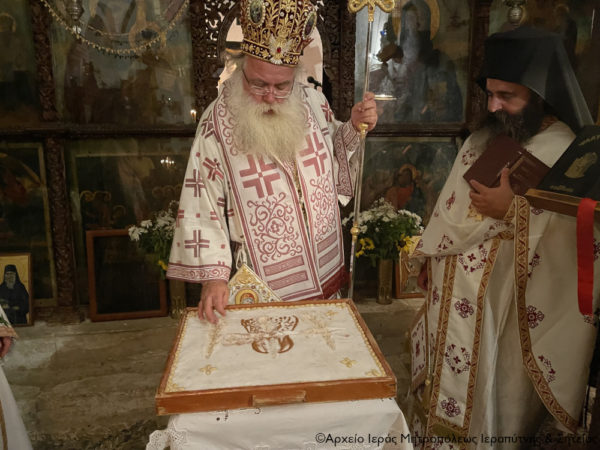 Στο σύντομο κήρυγμά του ο Σεβασμιώτατος κατά την Απόλυση της Θείας Λειτουργίας μίλησε για την πολυκύμαντη ζωή και τον οσιακό βίο και τα ασκητικά παλαίσματα του Αγίου Ιωσήφ στο τότε Μονύδριο του Καψά, το οποίο κατέστησε σημαντικό μοναστικό κέντρο και τόπο προσέλκυσης πολλών πιστών, και το κτηριακό συγκρότημα που ανήγειρε σήμερα δεσπόζει σαν αετοφωλιά πάνω από το απέραντο Νότιο Κρητικό Πέλαγος. Αφού αναφέρθηκε σε θαυματουργικές και ιαματικές επεμβάσεις του αγίου με τη δύναμη της προσευχής και την χάρη του Θεού, μίλησε για την οσιακή κοίμηση του κατά την ημέρα της μεγάλης Δεσποτικής εορτής της Μεταμορφώσεως του Κυρίου, γεγονός που μαρτυρεί, όπως σημείωσε, ότι ο Όσιος Ιωσήφ είχε μεταμορφώσει τη ζωή του και είχε γίνει και ο ίδιος μέτοχος τη χάριτος του Μεταμορφωθέντος Κυρίου. Επίσης, έκανε λόγο για τη μεγάλη ευλογία της Τιμίας Κάρας και του τάφου του Οσίου για την τοπική Εκκλησία και την Ιερά Μονή Καψά, όπου βρίσκεται ο τάφος και είναι αποθησαυρισμένα τα Ιερά Λείψανα του, και ευχήθηκε καρδιακά ο Όσιος Ιωσήφ ο Γεροντογιάννης ο Θαυματουργός να πρεσβεύει διηνεκώς στον Μεταμορφωθέντα Κύριο μας Ιησού Χριστό για όλους τους τιμώντας τη μνήμη και τους ευλαβείς και πιστούς προσκυνητές της Ιεράς Μονής που εκείνος ανακαίνισε και ανοικοδόμησε.
