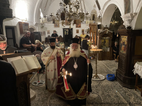 Το απόγευμα τελέσθηκαν οι Ακολουθίες του Μικρού Εσπερινού και της Ιεράς Παρακλήσεως προς τον Όσιο Ιωσήφ στον ιερό χώρο του σπηλαίου ασκήσεώς του, πάνω στην κόψη του επιβλητικού φαραγγιού των Περβολακίων, και στη συνέχεια το Μικρό Απόδειπνο και οι Χαιρετισμοί προς την Υπεραγία Θεοτόκο. Στις 10:30΄ η ώρα το βράδυ στο βοτσαλωτό προαύλιο του Καθολικού της Μονής ξεκίνησε η Ακολουθία του Μεγάλου Εσπερινού και της Λιτής, όπου ο Σεβ. Μητροπολίτης Ιεραπύτνης και Σητείας κ. Kύριλλος χοροστάτησε κατά την αγιορειτική τάξη και ευλόγησε τους προσφερόμενους άρτους. Στη συνέχεια ο Σεβ. χοροστάτησε κατά την Ακολουθία του Όρθρου και τέλεσε εντός του Καθολικού την Αρχιερατική Θεία Λειτουργία.