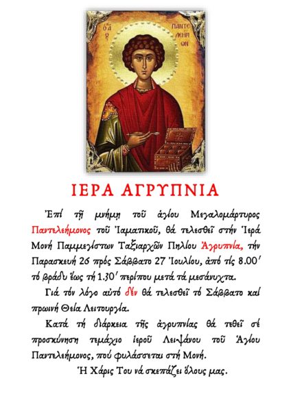 Στην Ι.Μ. Παμμεγίστων Ταξιαρχών Πηλίου, επί τη εορτή του Αγίου Παντελεήμονος του Ιαματικού θα τελεσθεί Αγρυπνία Παρασκευή 26 προς Σάββατο 27 Ιουλίου. Η Αγρυπνία θα ξακινήσει στις 8:00 μ.μ.