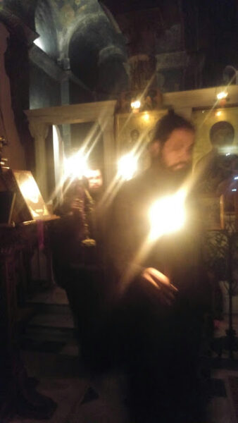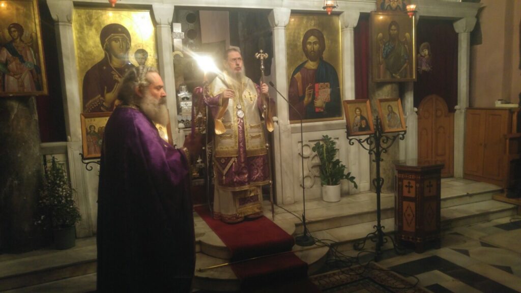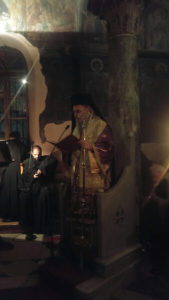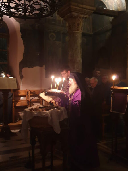 Από την Ιερά Αγρυπνία επί τη μνήμη του Οσίου πατρός ημών Αμφιλοχίου του Μακρή της Πάτμου στις 15/16 Απριλίου 2019, ιερουργούντος του Θεοφιλεστάτου Επισκόπου Θαυμακού και Καθηγουμένου της Ιεράς Μονής Ασωμάτων Πετράκη, κ. Ιακώβου: