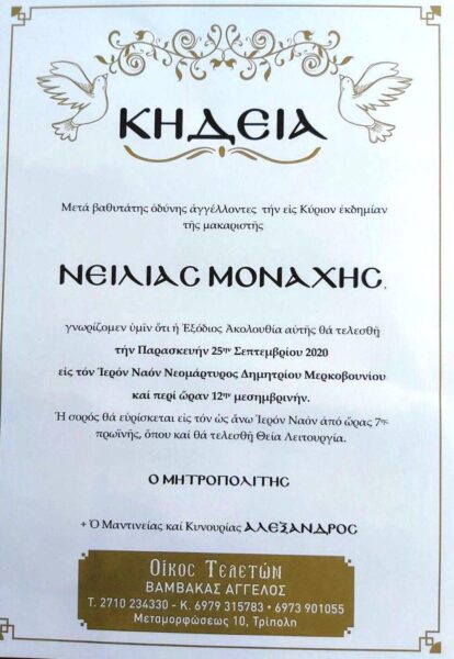 Η Εξόδιος Ακολουθία της μακαριστής Μοναχής Νειλίας θα τελεσθή αύριο (Παρασκευή 25 Σεπτεμβρίου 2020) και ώρα 12.00 μεσημβρινή στον Ιερό Ναό Νεομάρτυρος Δημητρίου Μερκοβουνίου προεξάρχοντος του Σεβ. Μητροπολίτου Μαντινείας και Κυνουρίας κ. Αλεξάνδρου.