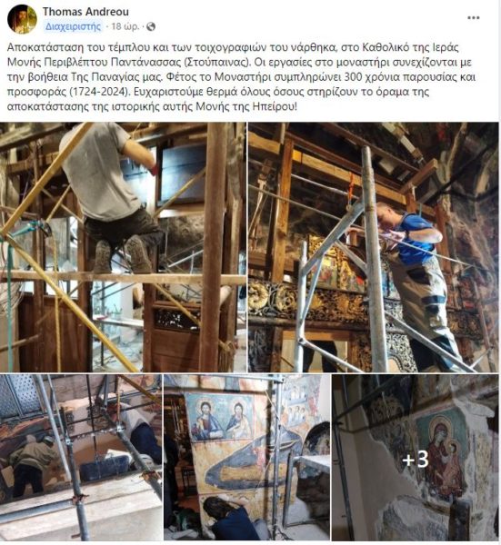 “Οι εργασίες στο μοναστήρι συνεχίζονται με την βοήθεια Της Παναγίας μας. Φέτος το Μοναστήρι συμπληρώνει 300 χρόνια παρουσίας και προσφοράς (1724-2024). Ευχαριστούμε θερμά όλους όσους στηρίζουν το όραμα της αποκατάστασης της ιστορικής αυτής Μονής της Ηπείρου!”, αναφέρει σε ανάρτησή του ο Αρχιμανδρίτης π. Θωμάς Ανδρέου, Πρωτοσύγκελλος της Ιεράς Μητροπόλεως Ιωαννίνων.