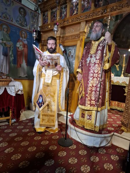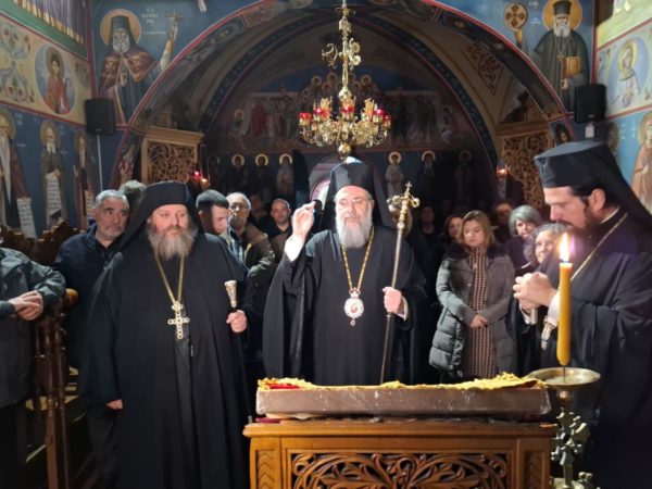 Στην Αρχιερατική Αγρυπνία προεξήρχε με την άδεια και ευλογία του Σεβασμιωτάτου Ποιμενάρχου, Μητροπολίτου Χαλκίδος, Ιστιαίας και Βορείων Σποράδων κ. Χρυσοστόμου, ο Σεβασμιώτατος Μητροπολίτης Τρίκης, Γαρδικίου και Πύλης κ. Χρυσόστομος, πλαισιούμενος από τον Καθηγούμενο Ιάκωβο, τους Πανοσ Αρχιμ Αχίλλιο Τσούτσουρα, Μεθόδιο Φουντούλη, εφημέριο Ιερού Προσκυνήματος Παναγίας Φανερωμένης Νέας Αρτάκης, Ιερόθεο Παπαγρηγορίου, εφημέριο ιερού ναού Αγίου Γεωργίου Βατώντος, τον Ιερομόναχο Αγαθόνικο Καρατζή, εφημέριο ιερού ναού Αγίας Τριάδος Αμφιθέας και τον Πρεσβύτερο Ζήση – Ιωάννη Φουρμούζη, εφημέριο ιερού ναού Αγίου Νικολάου Ερέτριας.