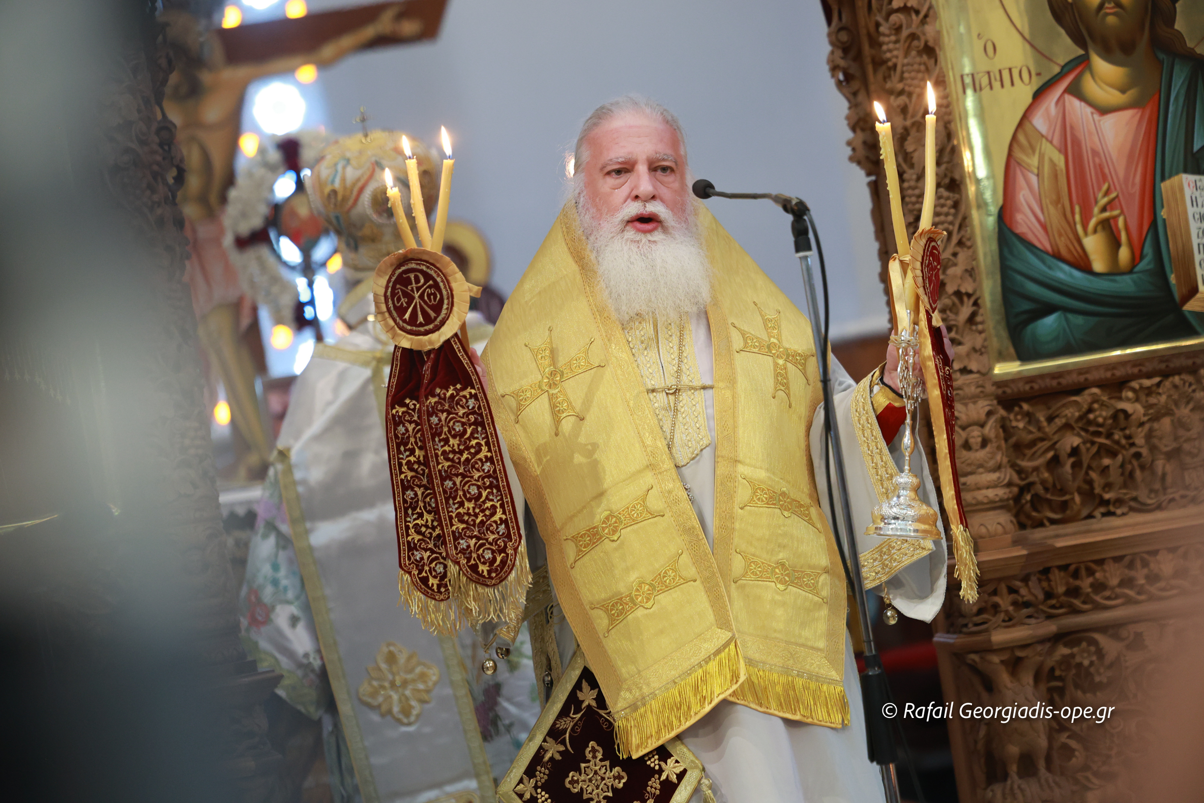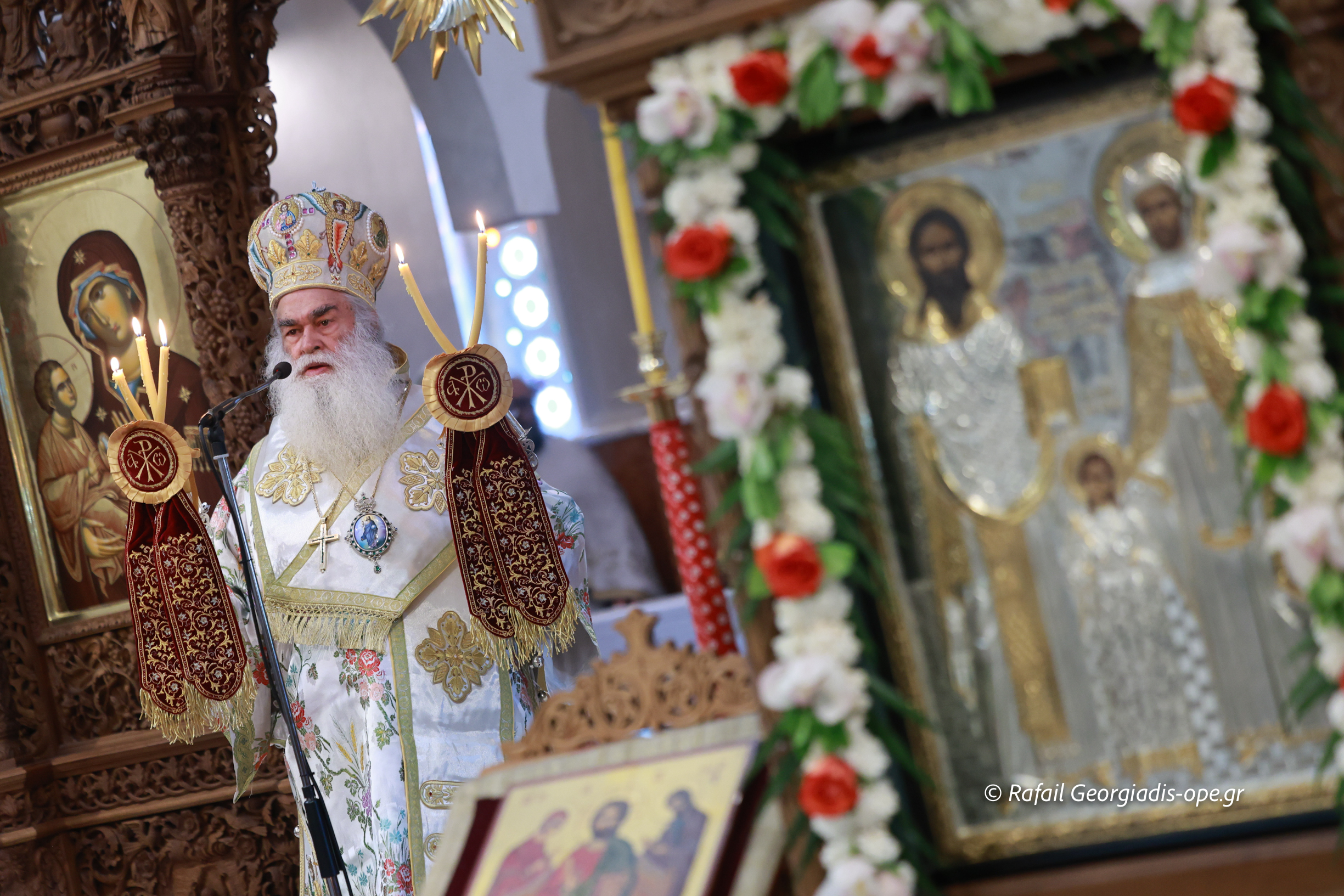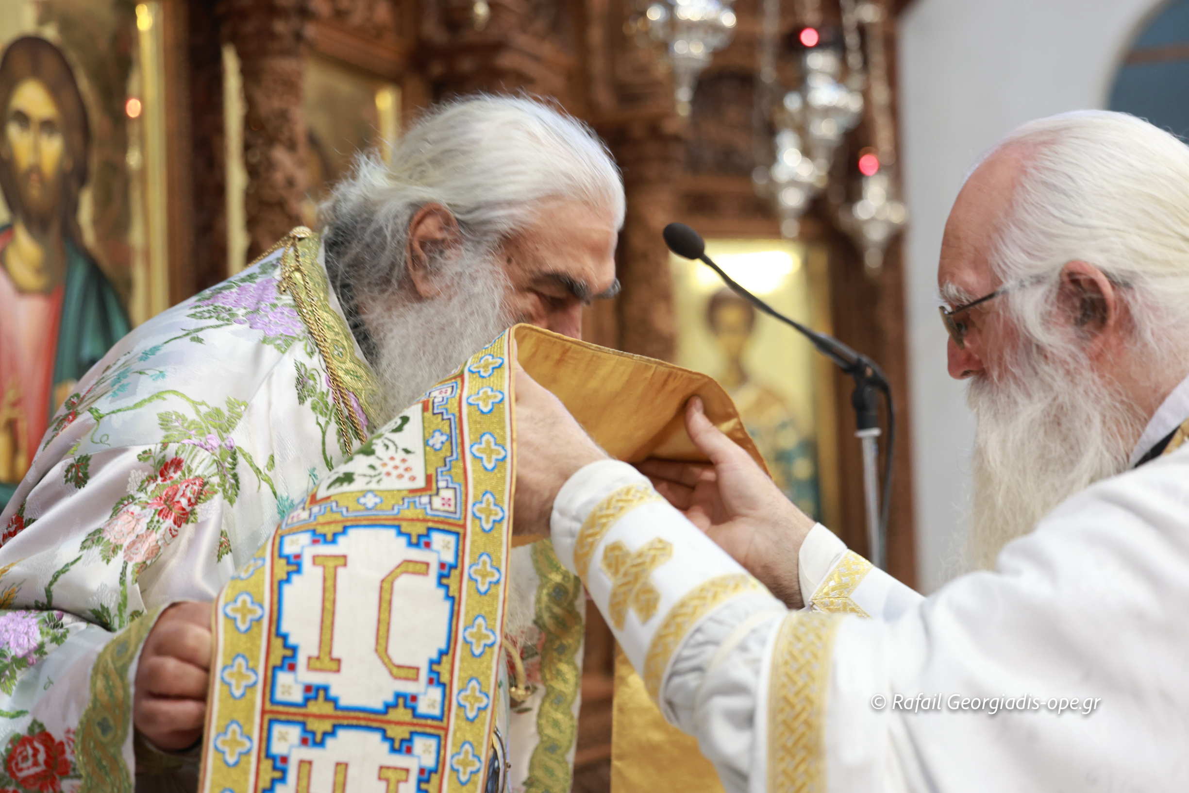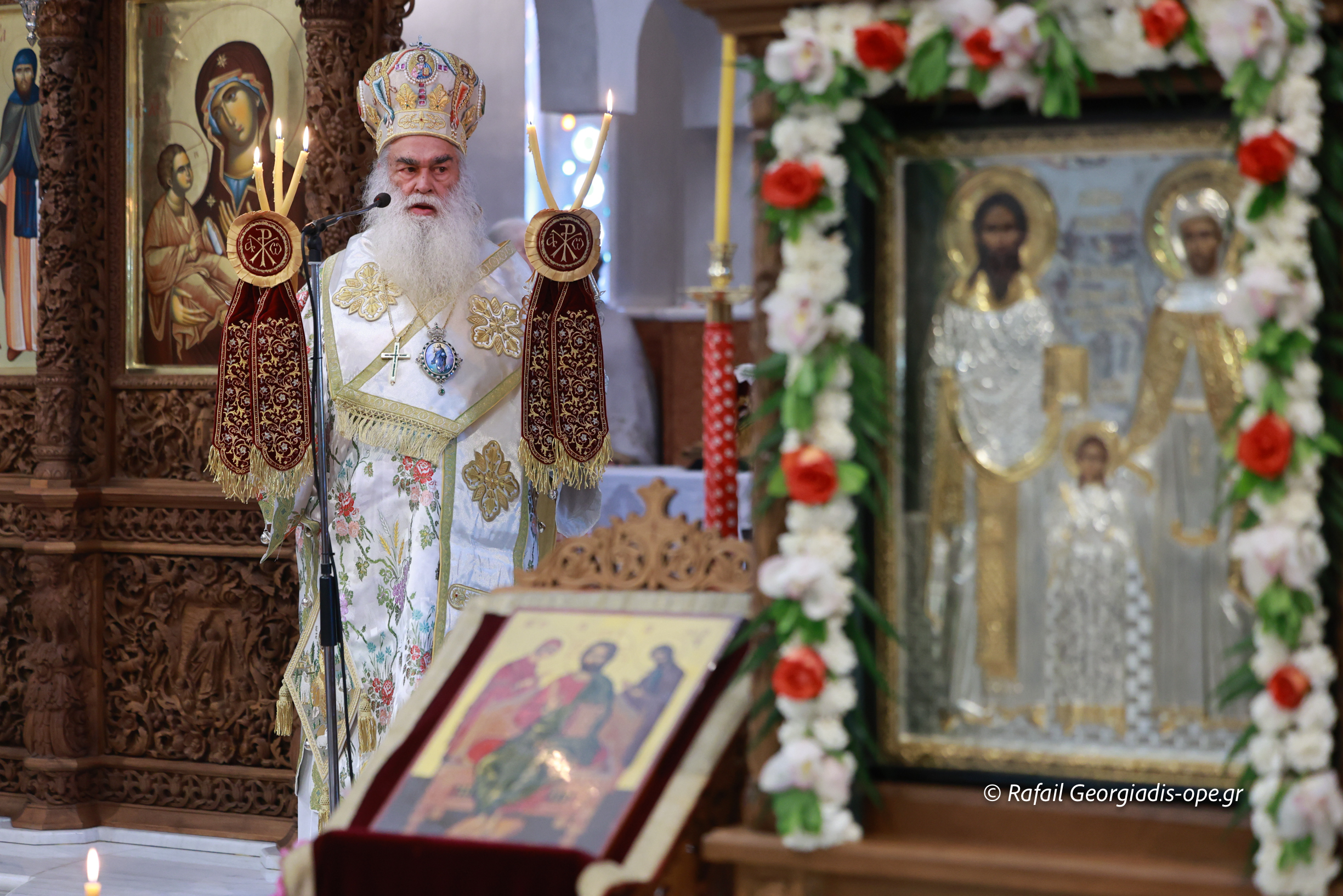 Στο τέλος της Θείας Λειτουργίας ο Σεβασμιώτατος ευχαρίστησε τον γέροντα Εφραίμ και του πρόσφερε την εικόνα των Αγίων Ραφαήλ, Νικολαου και Ειρήνης.