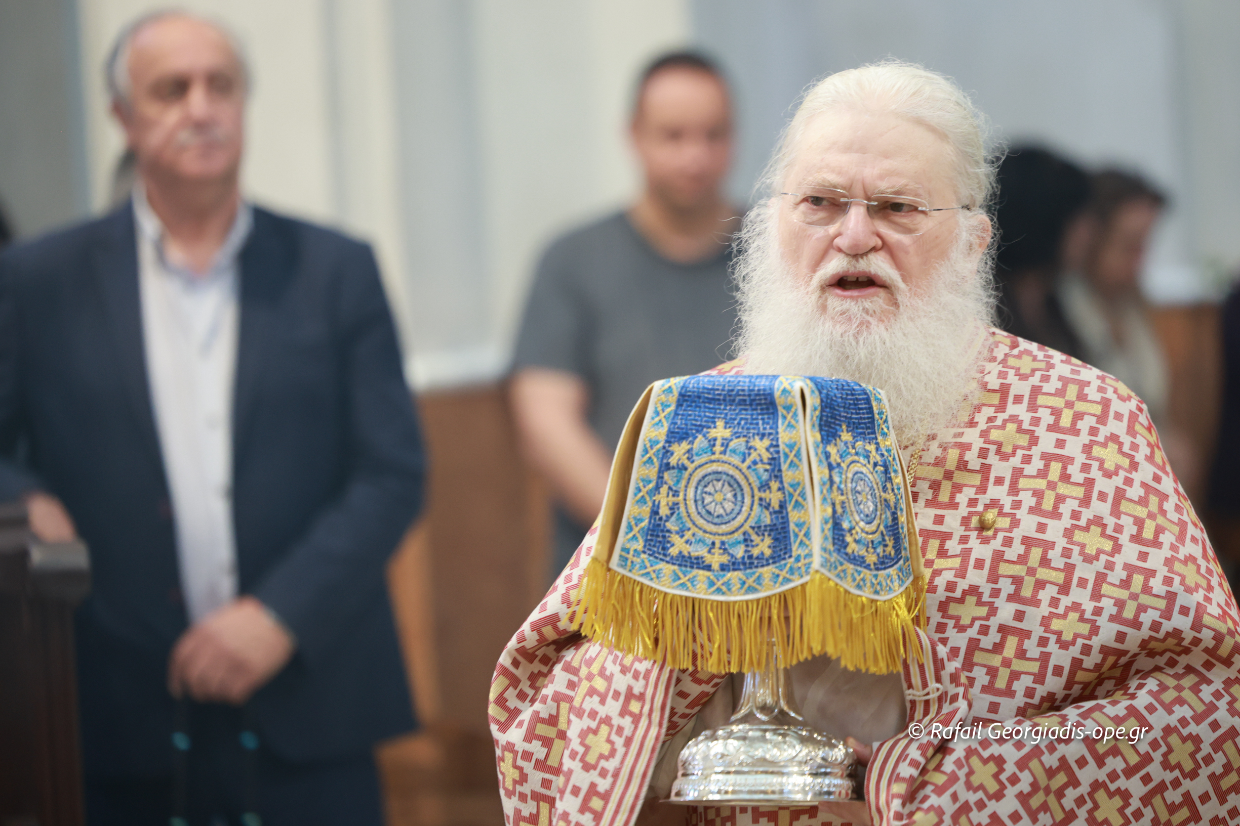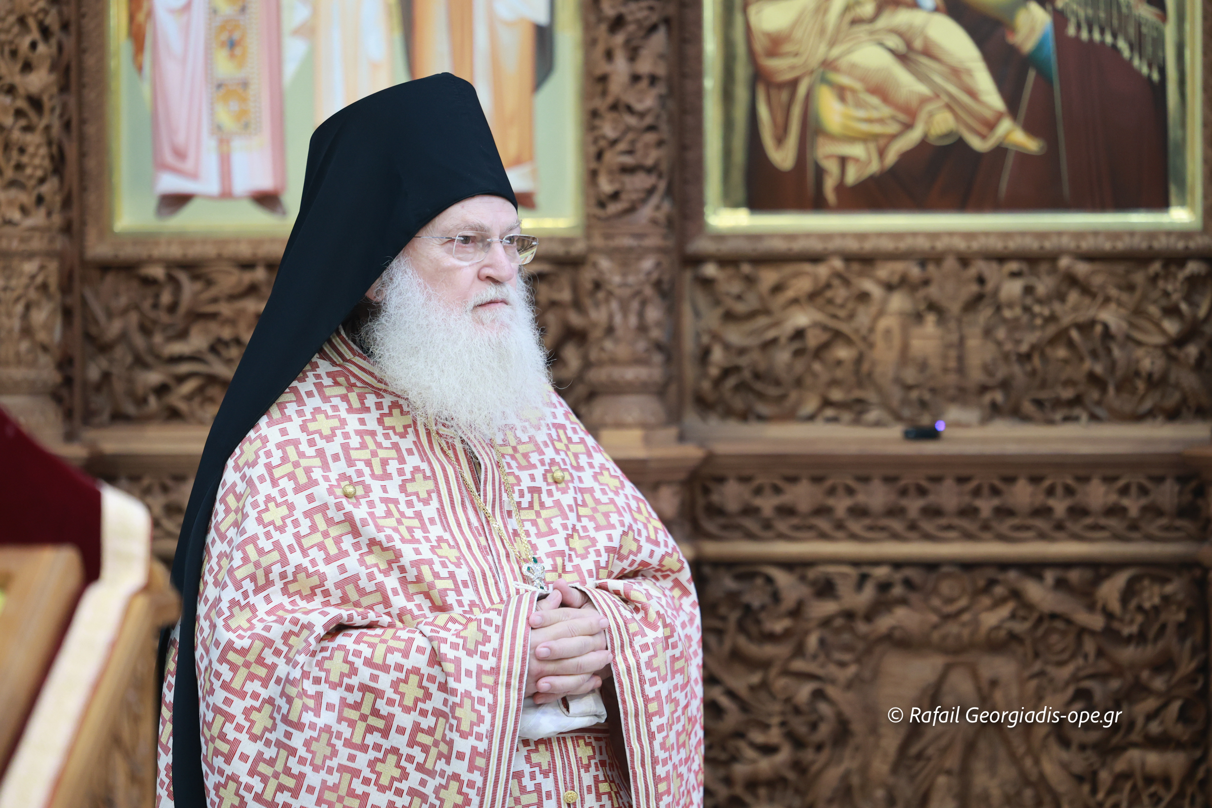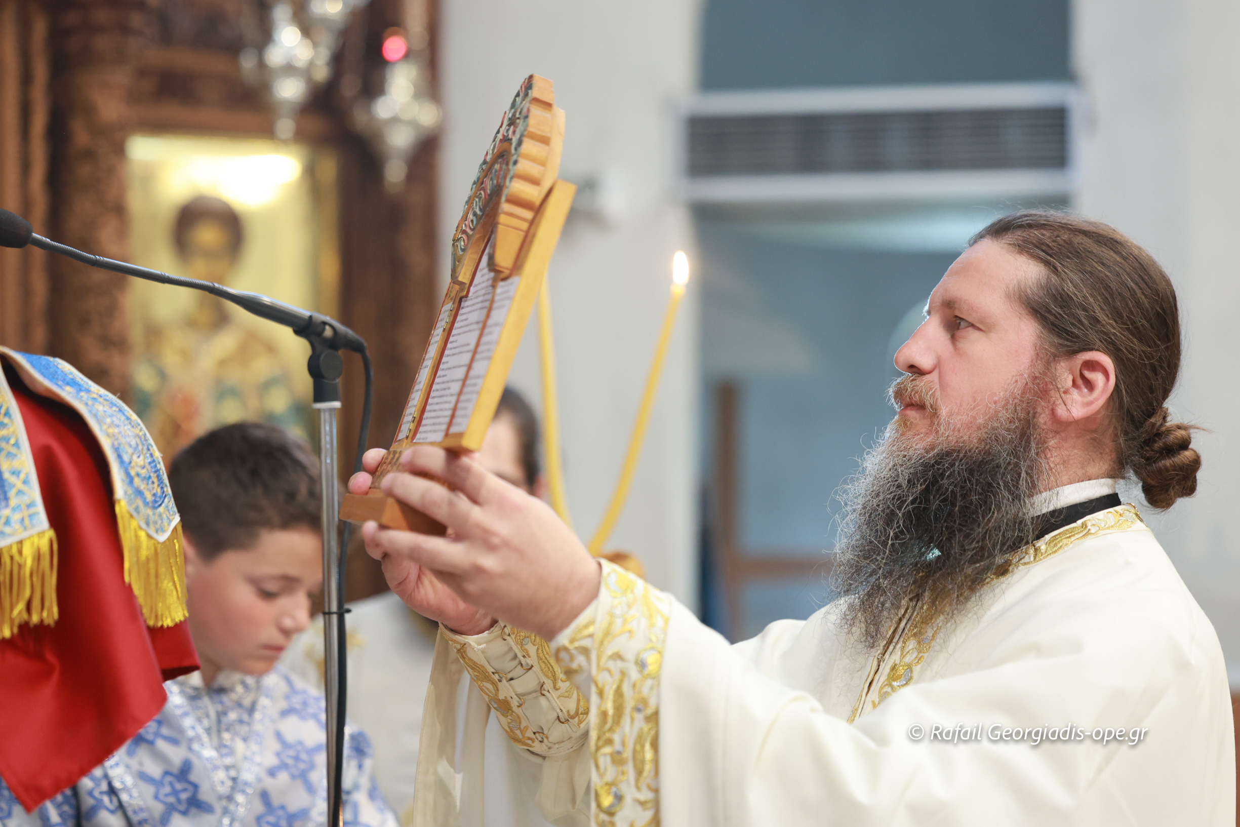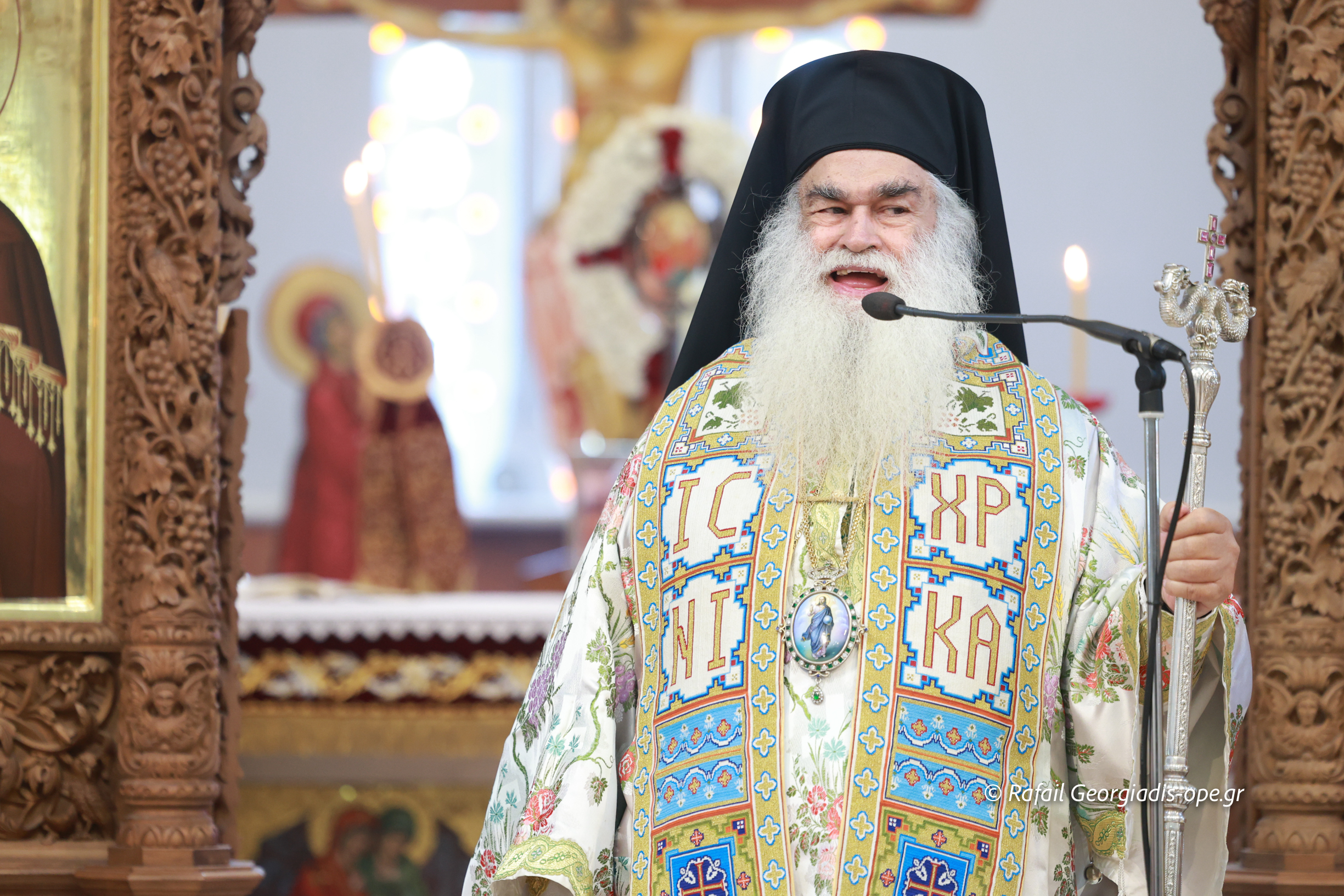 Στο τέλος της Θείας Λειτουργίας ο Σεβασμιώτατος ευχαρίστησε τον γέροντα Εφραίμ και του πρόσφερε την εικόνα των Αγίων Ραφαήλ, Νικολαου και Ειρήνης.