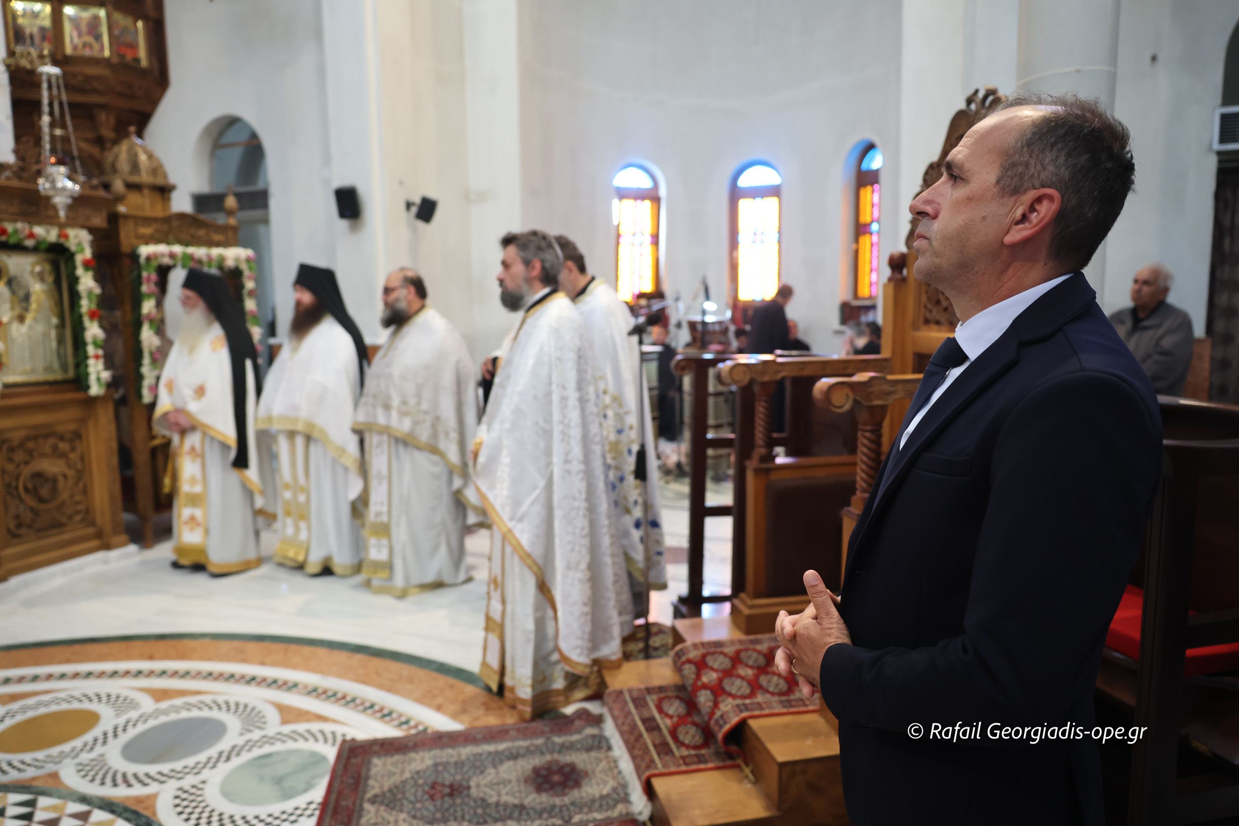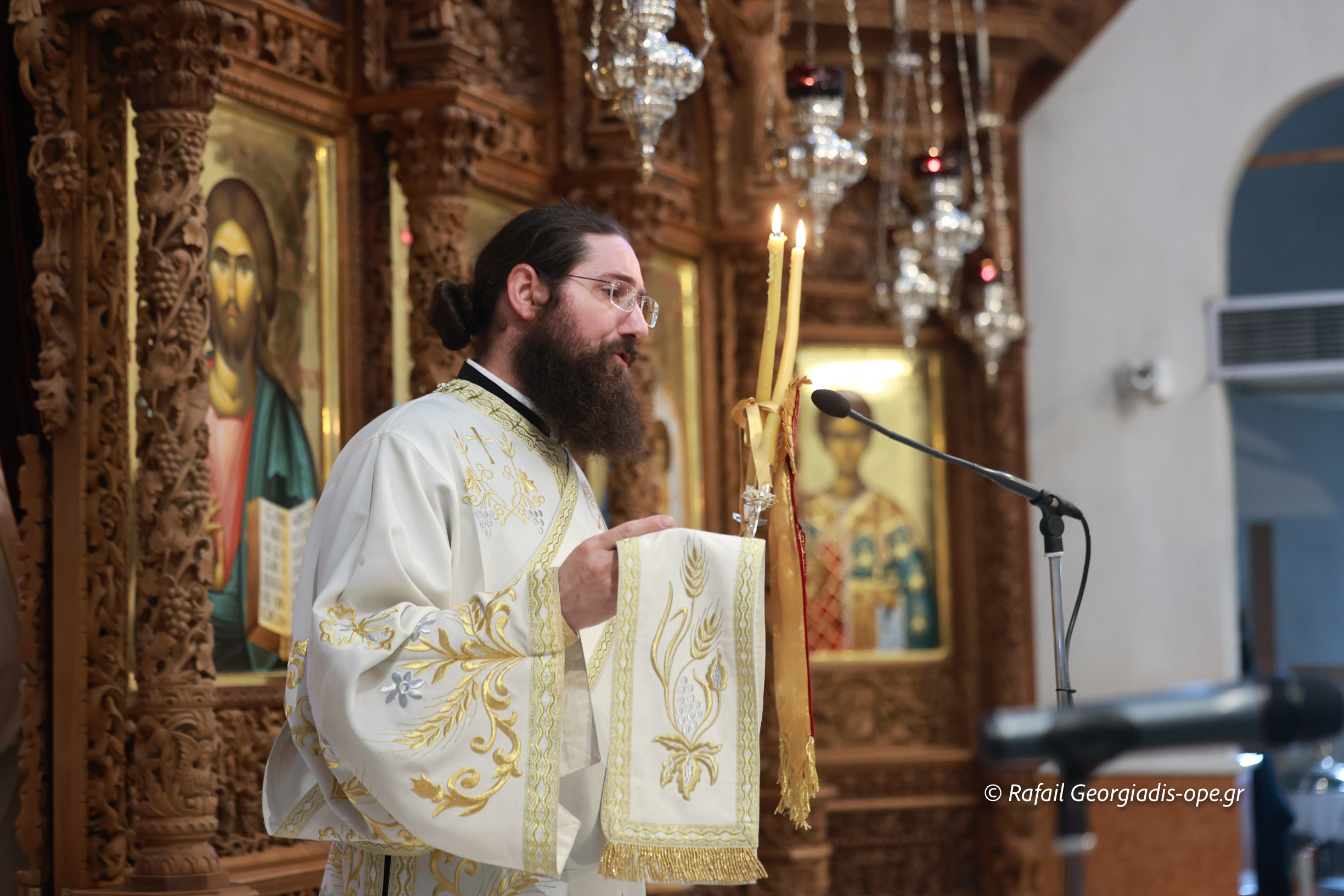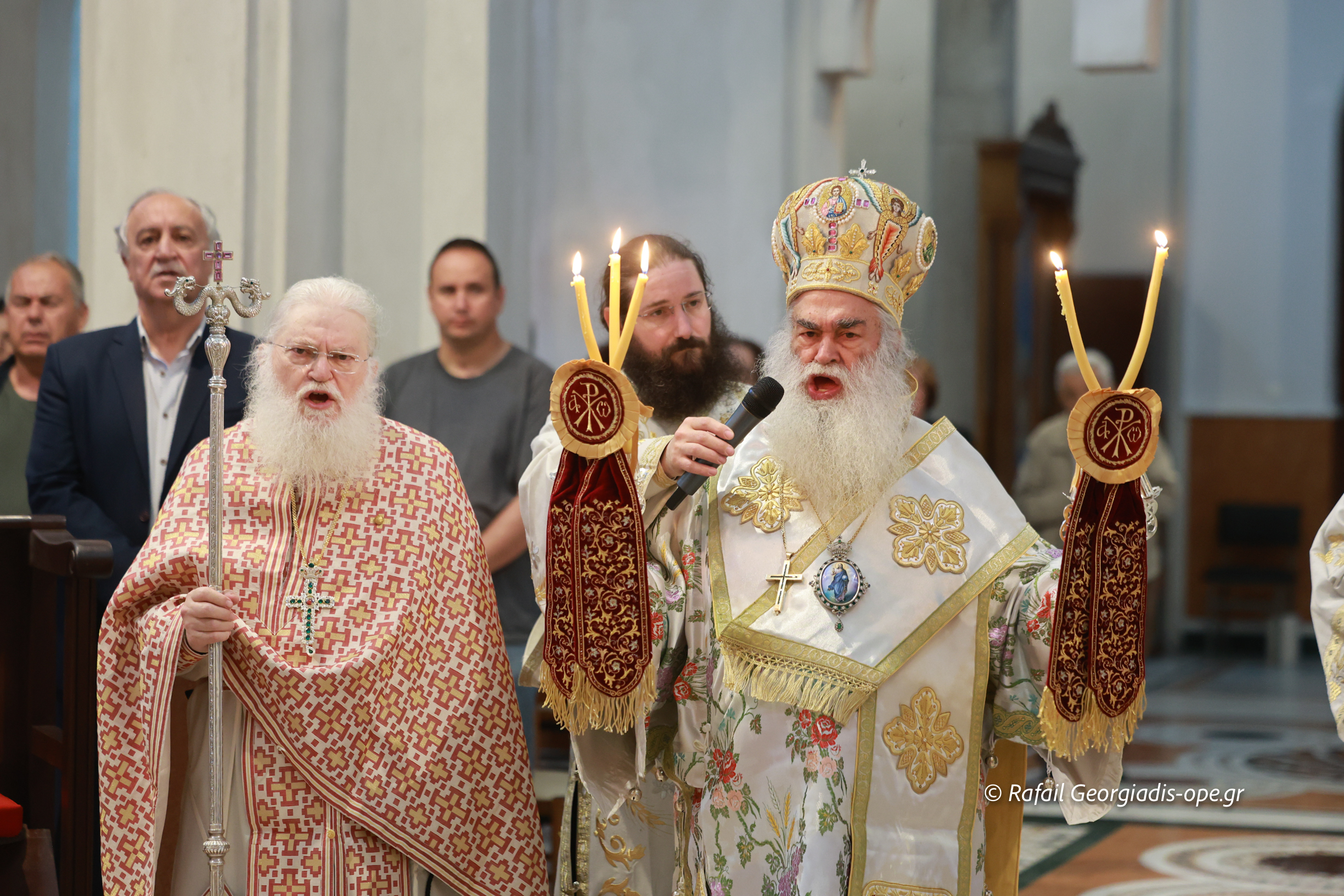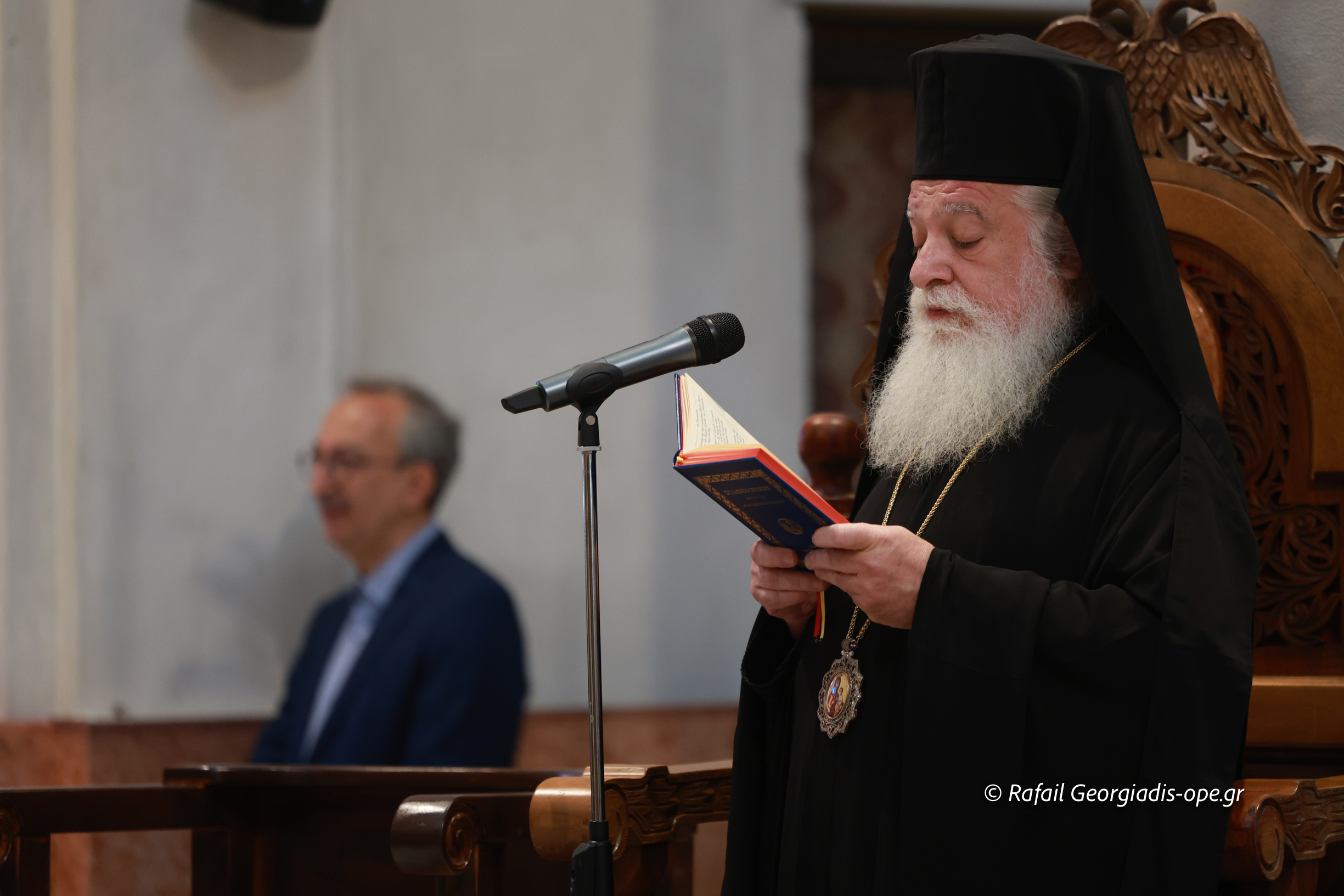 Στο τέλος της Θείας Λειτουργίας ο Σεβασμιώτατος ευχαρίστησε τον γέροντα Εφραίμ και του πρόσφερε την εικόνα των Αγίων Ραφαήλ, Νικολαου και Ειρήνης.