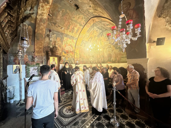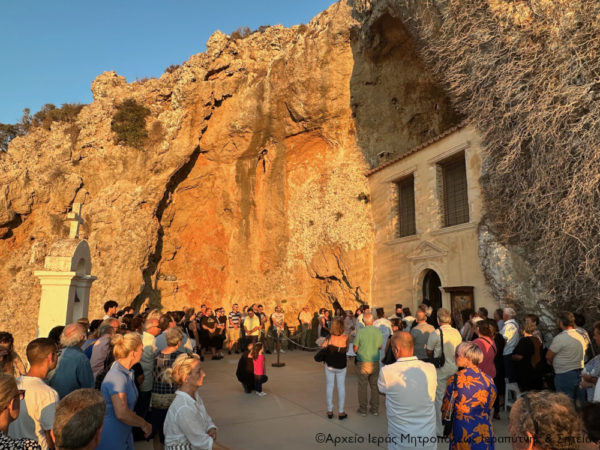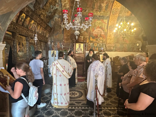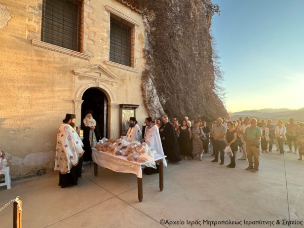 Πριν την Απόλυση ευλόγησε τους προσφερόμενους άρτους στον αύλειο χώρο του Καθολικού και μίλησε στους πολυπληθείς προσκυνητές για την μεγάλη εορτή της Κοιμήσεως της Θεοτόκου, για το ιερό της πρόσωπο αλλά και για την ευλογημένη και ιδιαίτερη σχέση που έχουν όλοι οι Λασιθιώτες με την Παναγία την Φανερωμένη και τη θαυματουργή εικόνα της.