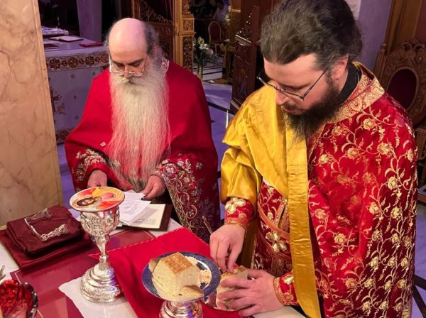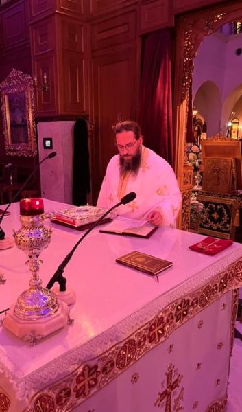 Κατά την ιερά αγρυπνία ιερούργησε ο Πανοσιολογιώτατος Αρχιμανδρίτης π. Ευσέβιος Σπανός, Ηγούμενος της Ιεράς Μονής Αγίας Λαύρας Καλαβρύτων, με συλλειτουργούς τον Αρχιμανδρίτη π. Φιλάρετο Θεοδωρακόπουλο, αδελφό της Μονής Αγίας Λαύρας, και τον Ιερομόναχο Γεννάδιο Βατοπαιδινό.