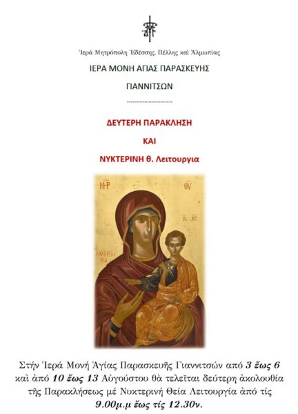 Στην Ιερά Μονή Αγίας Παρασκευής Γιαννιτσών από σήμερα 3 έως και τις 6/8 και από 10 έως 13 Αυγούστου θα τελείται δεύτερη ακολουθία της Παρακλήσεως με νυκτερινή Θεία Λειτουργία από 9.00 μ.μ έως 12.30 π.μ.