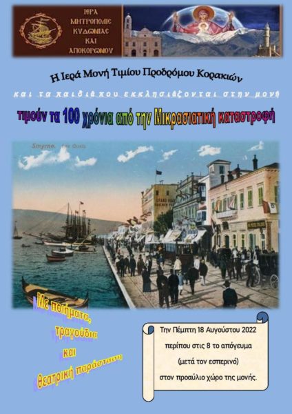 To Γραφείο Νεότητος της Ιεράς Μητροπόλεως Κυδωνίας και Αποκορώνου ενημερώνει για την εκδήλωση που διοργανώνουν απόψε η Ιερά Μονή Τιμίου Προδρόμου Κορακιών (στα Χανιά της Κρήτης) και τα παιδιά που εκκλησιάζονται στη Μονή, για να τιμήσουν τα 100 χρόνια από τη Μικρασιατική Καταστροφή.