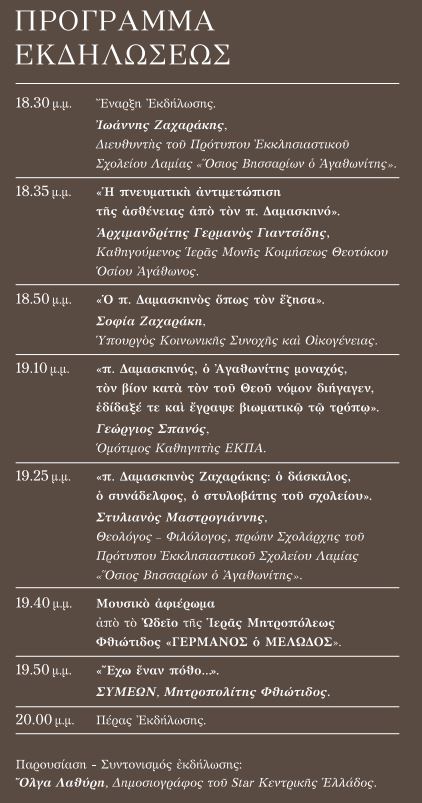 Εκδήλωση τιμής και μνήμης του μακαριστού Καθηγουμένου της Ιεράς Μονής Αγάθωνος π. Δαμασκηνού Ζαχαράκηθα πραγματοποιηθεί από την Ιερά Μονή την Τετάρτη, 4 Δεκεμβρίου, στις 18:30, στο Αμφιθέατρο του Πνευματικού και Διοικητικού Κέντρου της Ιεράς Μητροπόλεως Φθιώτιδος επί της οδού Μ. Αλεξάνδρου και Αγράφων, Ν. Άμπλιανης Λαμίας.