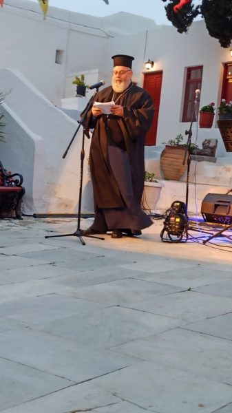 Χαιρετισμό προς την εκδήλωση και ευχές του Σεβασμιωτάτου Μητροπολίτη Σύρου κ. Δωροθέου Β΄ απηύθυνε ο επέχων θέση Ηγουμενοσυμβουλίου της Ιεράς Μονής Παλαιοκάστρου και Αρχιερατικός Επίτροπος Άνω Μεράς, Πρωτοπρ. Βασίλειος Τζανιδάκης.