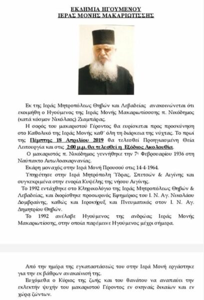 17/04/2019 17/04/2019 Την εκδημία του Ηγουμένου της Ιεράς Μονής Μακαριωτίσσης π. Νικοδήμου ( κατά κόσμον Νικολάου Ζιαμπάρα )  ανακοίνωσε με δελτίο τύπου που εξέδωσε η Ιερά Μητρόπολη Θηβών και Λεβαδείας. Η σορός του μακαριστού Γέροντος θα βρίσκεται προς προσκύνηση στο Καθολικό της Ιεράς Μονής καθ’ όλη τη διάρκεια της νύχτας. Το πρωί θα τελεστεί Προηγιασμένη Θεία Λειτουργία...